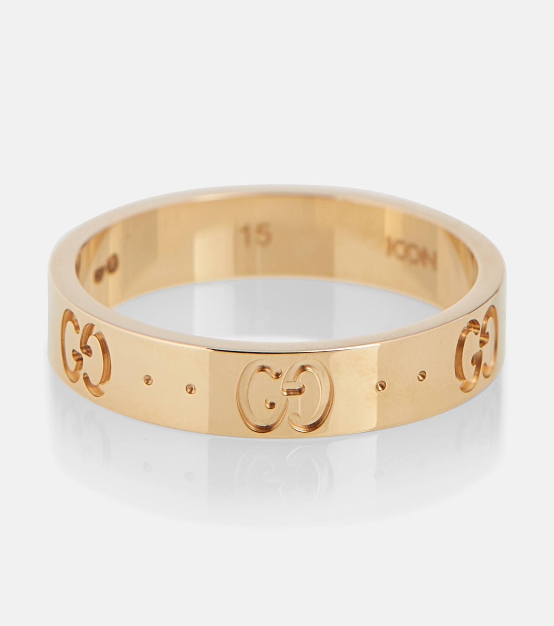 This 18kt yellow gold ring from Gucci will suit both minimalists and maximalists alike. The slender band is engraved with the house's Double G motif and can be worn on its own, or as part of a stacked look with other favorites from the brand. Product Details - Made in Italy - Designer color name: Gold - Item number: P00585876 Size & Fit - Width 4mm-0.15"
