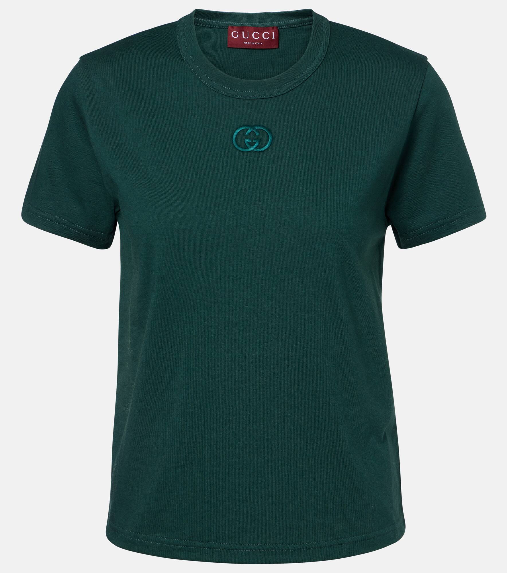 Show your brand love with subtle everyday staples like this Gucci T-shirt, crafted from soft cotton jersey and finished with an embroidered Interlocking G at the front. Product Details - Material: 100% cotton - Care instructions: machine wash at 30 degrees - Made in Italy - Designer color name: Green/Mix - Item color: green - Embroidery: 100% polyester - Collar: crewneck - Item number: P01088196 Size & Fit - True to size - Straight fit - Slightly stretchy fabric - Falls to the hip - The model seen in the picture is 178cm-5'10" and wearing a size XS