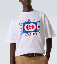 Gucci's collections are both a reflection of the past and a glimpse into the future. This T-shirt is made in Italy from cotton jersey and features a vibrant print of the brand's iconic Interlocking G logo. Product Details - Material: 100% cotton - Care instructions: machine wash at 30 degrees - Made in Italy - Designer color name: White - Item color: white, blue, red - Collar: crewneck - Sleeves: short-sleeved - Item number: P01138208 Size & Fit - True to size - Dropped shoulders - Designed for a loose fit - Non-stretchy fabric - Falls below the hip - The model in the picture is 185cm-6'1" and wearing a size L