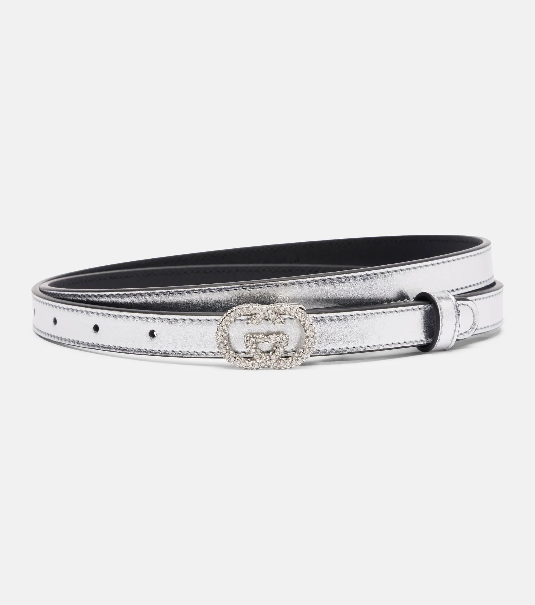 This essential Gucci belt is a slim design that will elevate any outfit. Made from silver metallic leather, the versatile accessory features an Interlocking G buckle entirely covered in sparkling crystals. Product Details - Material: calf leather - Lining: leather - Made in Italy - Designer color name: Silver/Crystal - Item color: silver - Hardware color: silver - Includes: dust bag - Item number: P01118088 Size & Fit - Width 1.5cm-0.5" - Buckle width 2cm-1"