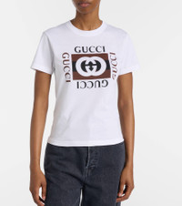 Made in Italy from pure cotton, this T-shirt from Gucci has a classic crewneck collar and short sleeves. The design is finished with the iconic Interlocking G print at the center. Product Details - Material: 100% cotton - Care instructions: machine wash at 30 degrees - Made in Italy - Designer color name: White/Brown/Mc - Item color: white, brown - Item number: P01082374 Size & Fit - True to size - Straight fit - Non-stretchy fabric - Slightly cropped - The model seen in the picture is 178cm-5'10" and wearing a size XS