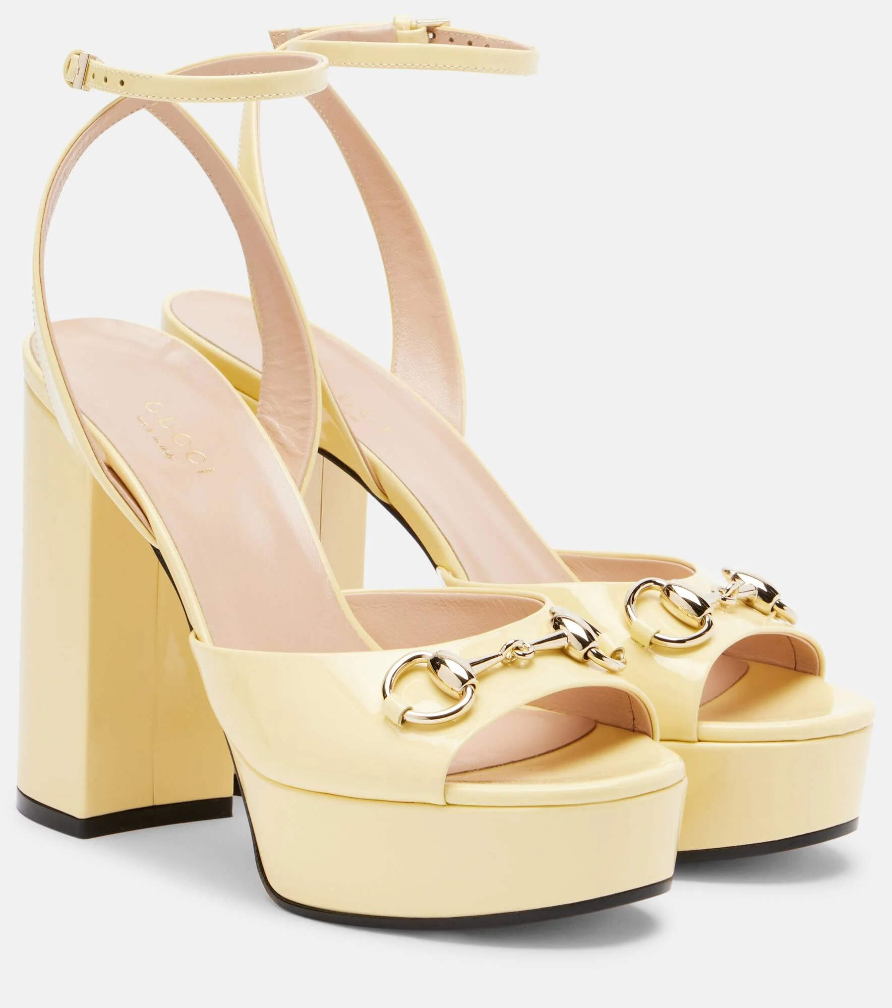 One of Gucci's most powerful emblems, the Horsebit points to the house's storied fascination with equestrian design codes. Made from patent leather, the Lady Horsebit platform sandals are aptly named after the signature hardware and finished with 85mm heels. Product Details - Upper: goat leather - Lining: leather - Sole: leather insole, leather and rubber sole - Color: yellow - Toe shape: round open toe - Made in Italy - Includes: shoe box, dust bag - Designer color name: Daylight Yellow - Hardware color: gold - Closure: buckle-fastening ankle strap - Item number: P01131174 Size & Fit - Fits slightly small to size - we recommend trying a half size larger - European sizes - 11,5cm-4.5" heel - 3cm-1" platform