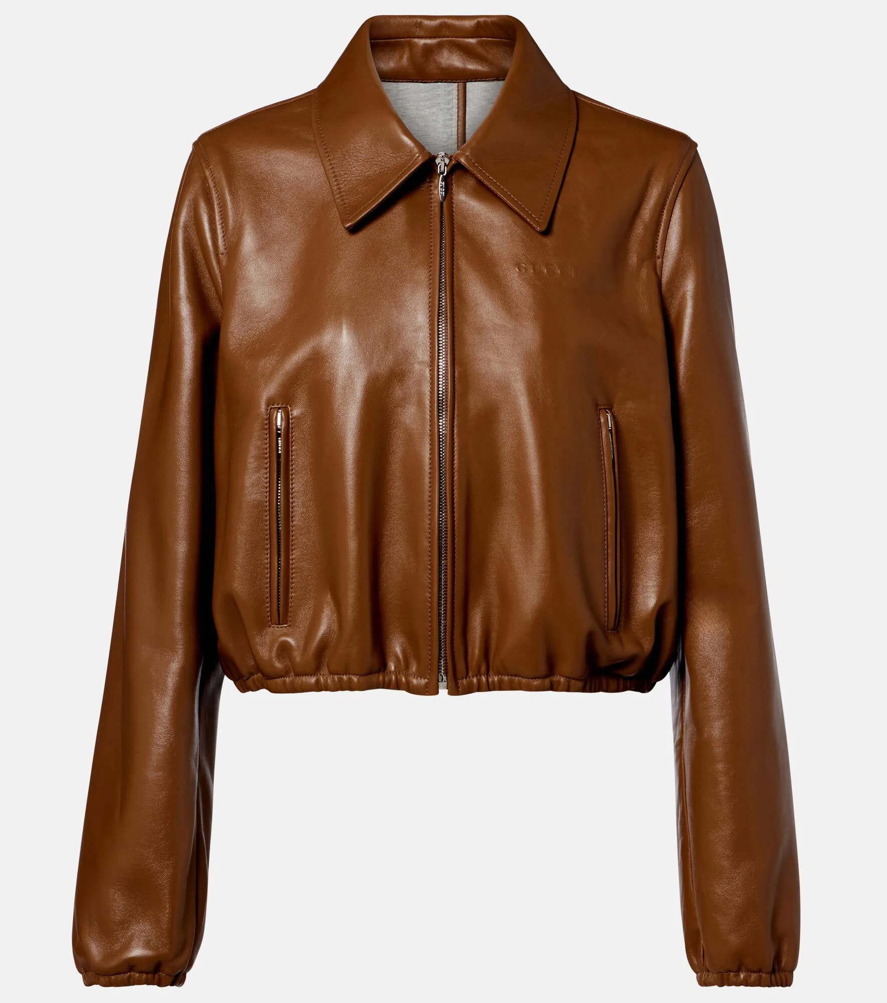 An iconic name within fashion on a global scale, Gucci was founded in Florence in 1921. This bomber jacket is made from leather in Italy with a classic collar. Product Details - Material: 100% lamb leather - Care instructions: specialist clean - Made in Italy - Color: brown - Designer color name: Honey Biscuit/Grey M - Lining: 100% cotton - Contains non-textile parts of animal origin - Hardware color: silver - Cuff: elasticated - Pockets: zipped pockets - Closure: zipped front - Includes: dust bag - Item number: P01119191 Size & Fit - True to size - Designed for a loose fit - Elasticated hem - Non-stretchy fabric - Cropped - The model seen in the picture is 178cm-5'10" and wearing a size IT 40