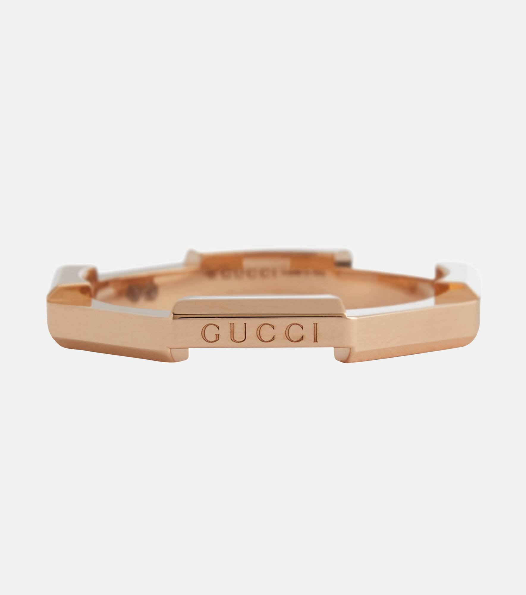 This ring is part of Gucci's Link to Love collection, which is a contemporary take on symbols of romance. It's made in Italy from 18kt rose gold and subtly engraved with the label logo. Product Details - Material: 18kt rose gold - Made in Italy - Designer color name: Pink Gold - Item number: P00585731 Size & Fit - Width 3mm-0.1"