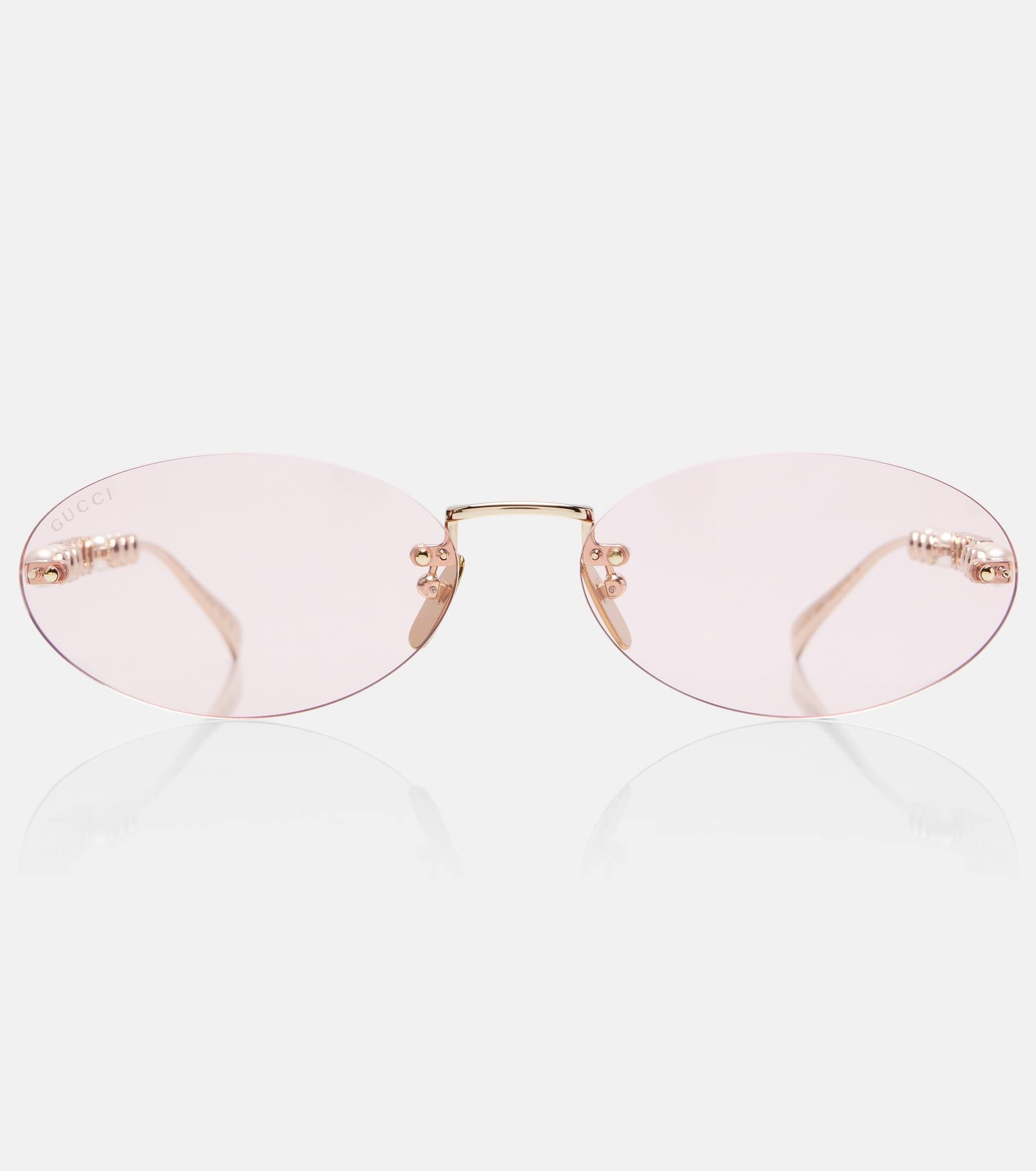 These Gucci oval sunglasses have unrimmed, clear lenses with a slight tint. Subtle logo lettering and faux pearl embellishments on the temples bring a whimsical, high-glamour twist to a classic sunglass shape. Product Details - Frame material: metal - Frame color: gold - Lens filter category 1 - Lens color: rosy pink - Made in Japan - Includes: hard case, case, cleaning cloth - Designer color name: Gold-Gold-Pink - The color of the case may vary - Item number: P01042877 Size & Fit - Lens width: 62mm-2.45" - Bridge size: 17mm-0.65" - Earpiece length: 140mm-5.5"