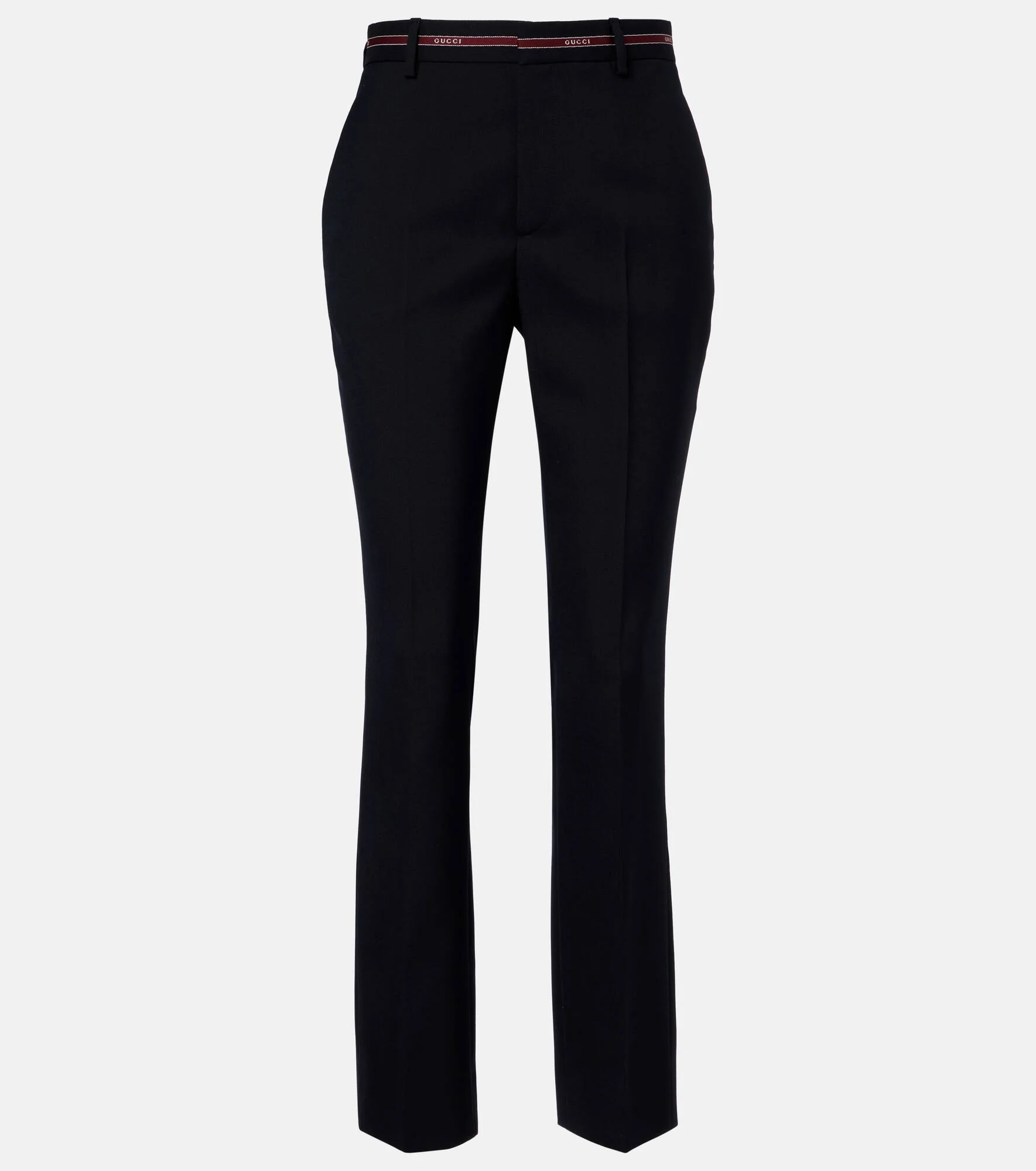 Defined by Gucci’s modern elegance, these blue wool straight pants feature a tailored silhouette with a sleek fit. A contrasting logo at the belt loop adds a subtle, refined signature detail to elevated everyday style. Product Details - Material: 100% wool - Care instructions: dry clean - Made in Italy - Color: blue - Designer color name: Blue/Red - Pocket lining: 100% viscose - Closure: zipper fly, button and hook fastenings - Item number: P01119205 Size & Fit - True to size - Tight fit at thighs - Non-stretchy fabric - Straight leg - High-waisted - Height of model is 174cm-68.5" and wears a size IT 40