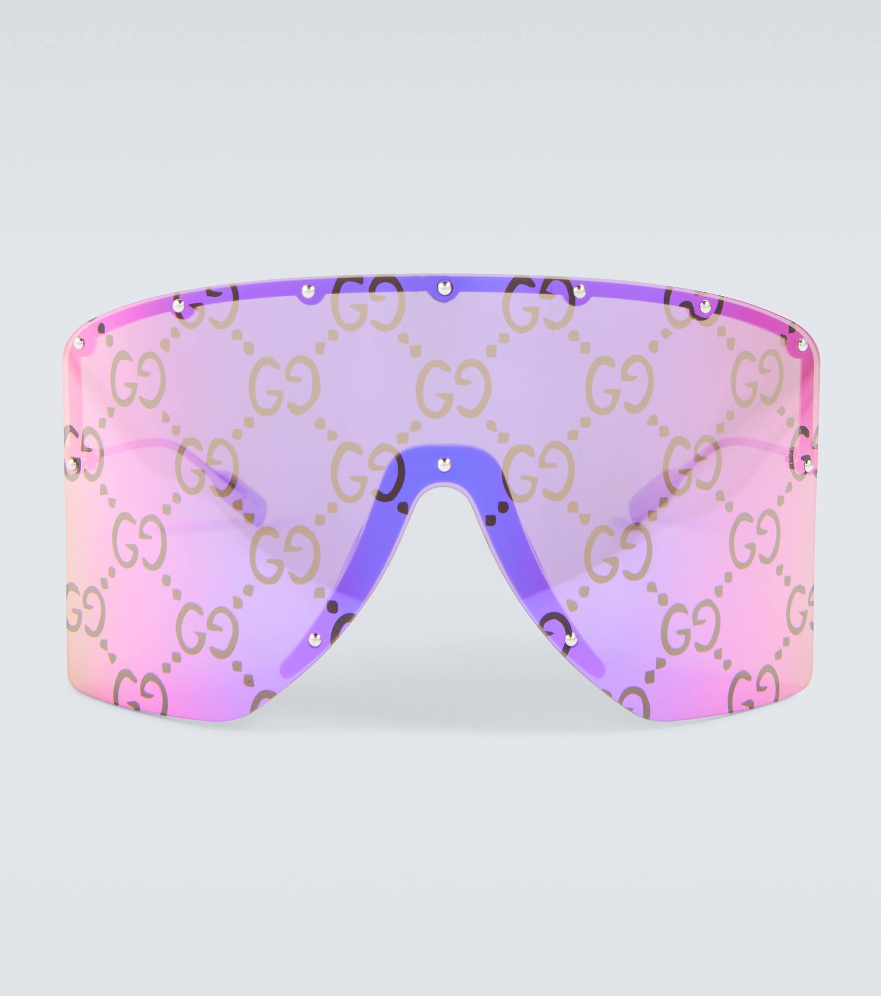 Gucci's mask sunglasses fuse sport detailing with studded glamour. The acetate frames are decorated with a monogram print and completed with Interlocking G detailing on the temples. Product Details - Frame color: silver - Frame material: metal - Lens color: yellow - comes with cleaning cloth - The color of the case may vary, comes in a case - Lens filter category 3 - Made in Italy - Item number: P00689088 Size & Fit - Lens width: 99mm-3.9" - Bridge size: 1mm-0.05" - Earpiece length: 125mm-4.9"