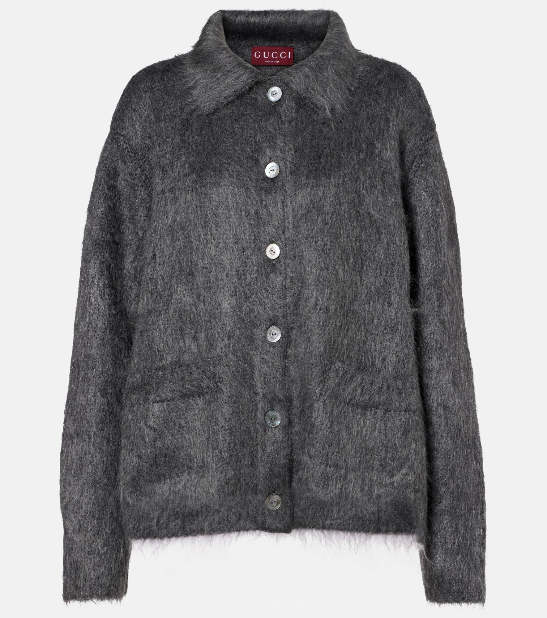 This Gucci cardigan is handcrafted in Italy from a soft mohair blend. The piece is designed with a slightly oversized silhouette and features a buttoned front and a classic collar. Product Details - Material: 67% mohair, 28% polyamide, 5% wool - Care instructions: dry clean - Made in Italy - Designer color name: Urban Grey - Item color: gray - Details: 60% viscose, 40% cotton - Contains non-textile parts of animal origin - Pockets: welt pockets - Closure: buttoned front - Item number: P01088135 Size & Fit - True to size - Dropped shoulders - Designed for a loose fit - Stretchy fabric - Falls below the hip - The model seen in the picture is 178cm-5'10" and wearing a size XS
