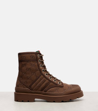 Made from canvas, these ankle boots showcase Gucci's iconic all-over GG print. The New Sherlin boots include rounded toes and are finished with lace-up closures and the brand's signature green and red Webstripes. Product Details - Upper: fabric - Lining: fabric - Sole: leather insole, rubber sole - Toe shape: round toe - Made in Italy - Includes: shoe box - Designer color name: Cr.Br/Cr.Br/Cr.B/Vrv - Item color: brown - Item number: P01096558 Size & Fit - True to size - European sizes - 2,5cm-1" platform (size EU 38) - 4cm-1.5" wedge heel (size EU 38)