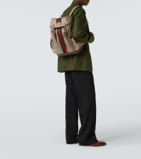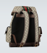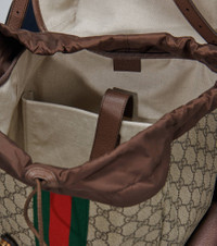 Combining Gucci's iconic GG monogrammed canvas with red and green web detailing, this brown backpack has a hiking-inspired shape with adjustable buckle closures, side pockets and a padded mesh backing. Product Details - Top handle, Adjustable shoulder straps - Material: fabric - Made in Italy - Zipped side pocket - Closure: drawstring top, slot-tab fastening - Item number: P00471147 Size & Fit - Height 42cm-16.5" - Min. width 25cm-10" - Max. width 41cm-16" - Depth 20cm-8" - Min. length shoulder strap 45cm-17.5" - Max. length shoulder strap 84cm-33"