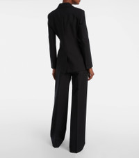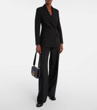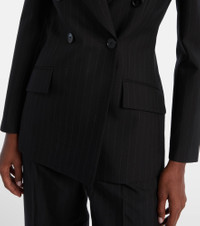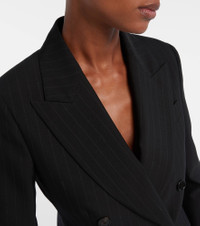 An iconic name within fashion on a global scale, Gucci redefines luxury and pursues its commitment to excellence and creativity. This double-breasted blazer is Italian-made from wool with all-over logo-detailed pinstripes. Product Details - Material: 100% wool - Care instructions: dry clean - Made in Italy - Designer color name: Black/Mc - Item color: black - Lining: 100% viscose - Peak lapel - Closure: double-breasted (four buttons) - Pockets: flap pockets, angled chest pocket, internal pockets - Cuff: one button - Vent: single - Item number: P01052685 Size & Fit - True to size - Shoulder pad inserts - Cinched waist - Non-stretchy fabric - Falls below the hip - The model seen in the picture is 178cm-5'10" and wearing a size IT 40
