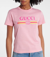 Crafted in Italy from cotton jersey, this T-shirt from Gucci features the brand's name lettered across the chest. This design also showcases the iconic interlocking G and Web Stripe motifs. Product Details - Material: 100% cotton - Care instructions: machine wash at 30 degrees - Made in Italy - Designer color name: Hued Blush/Mc - Item color: pink - Collar: crewneck - Item number: P01052926 Size & Fit - True to size - Straight fit - Slightly stretchy fabric - Falls to the hip - The model seen in the picture is 178cm-5'10" and wearing a size XS