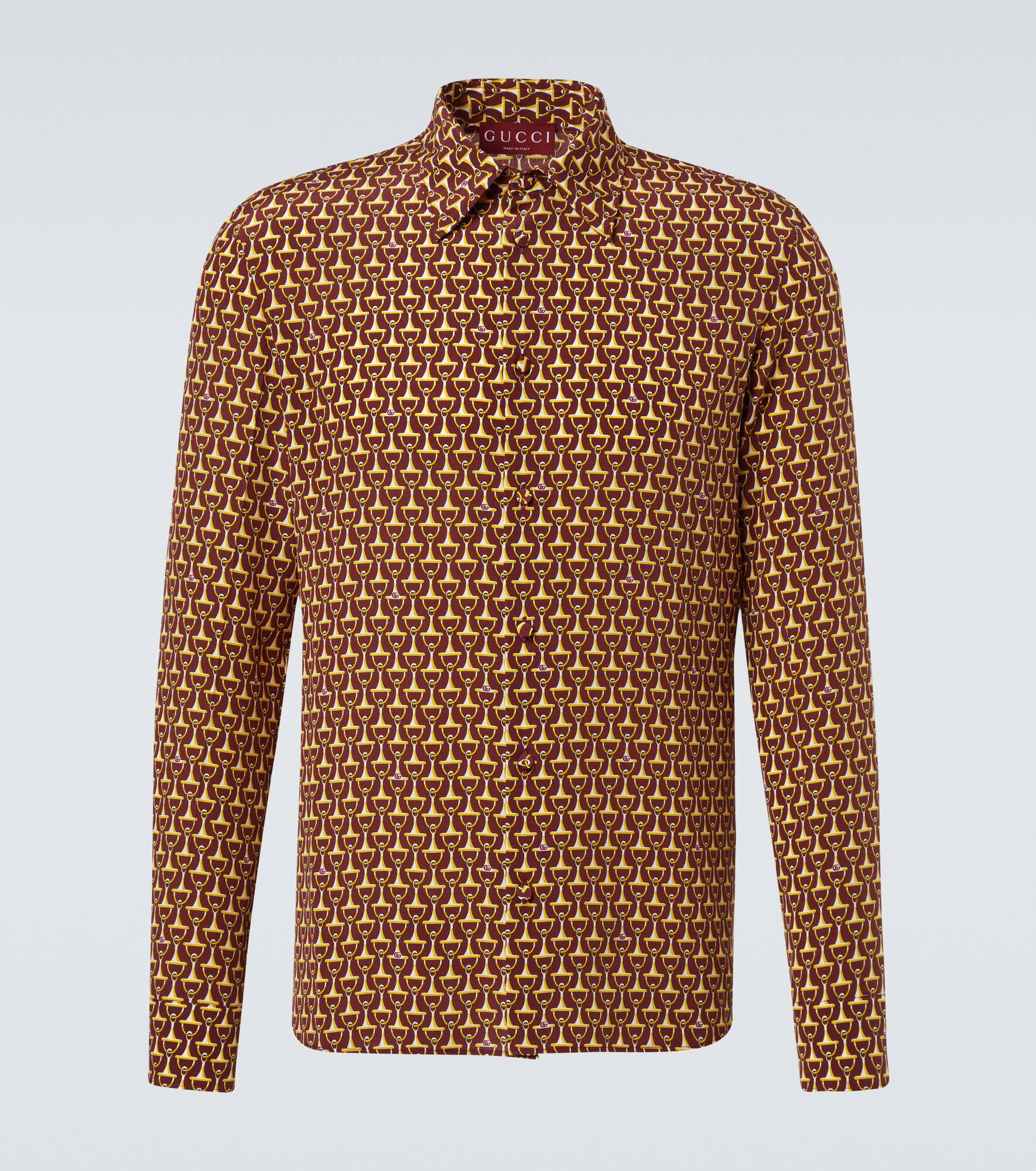 Energize daily and formal looks with this shirt from Gucci. The design is crafted from fluid silk, has a slim fit, and is topped with a vibrant print. Product Details - Material: 100% silk - Care instructions: dry clean - Made in Italy - Designer color name: Rosso Ancora/Gold/Mc - Item color: burgundy, yellow - Collar: classic (Straight point) - Cuff: buttoned - Closure: buttoned placket - Item number: P01078839 Size & Fit - True to size - Without pleats in the back - Slim fit - Non-stretchy fabric - Falls below the hip - Height of model is 189cm-74.5" and wears a size IT 50