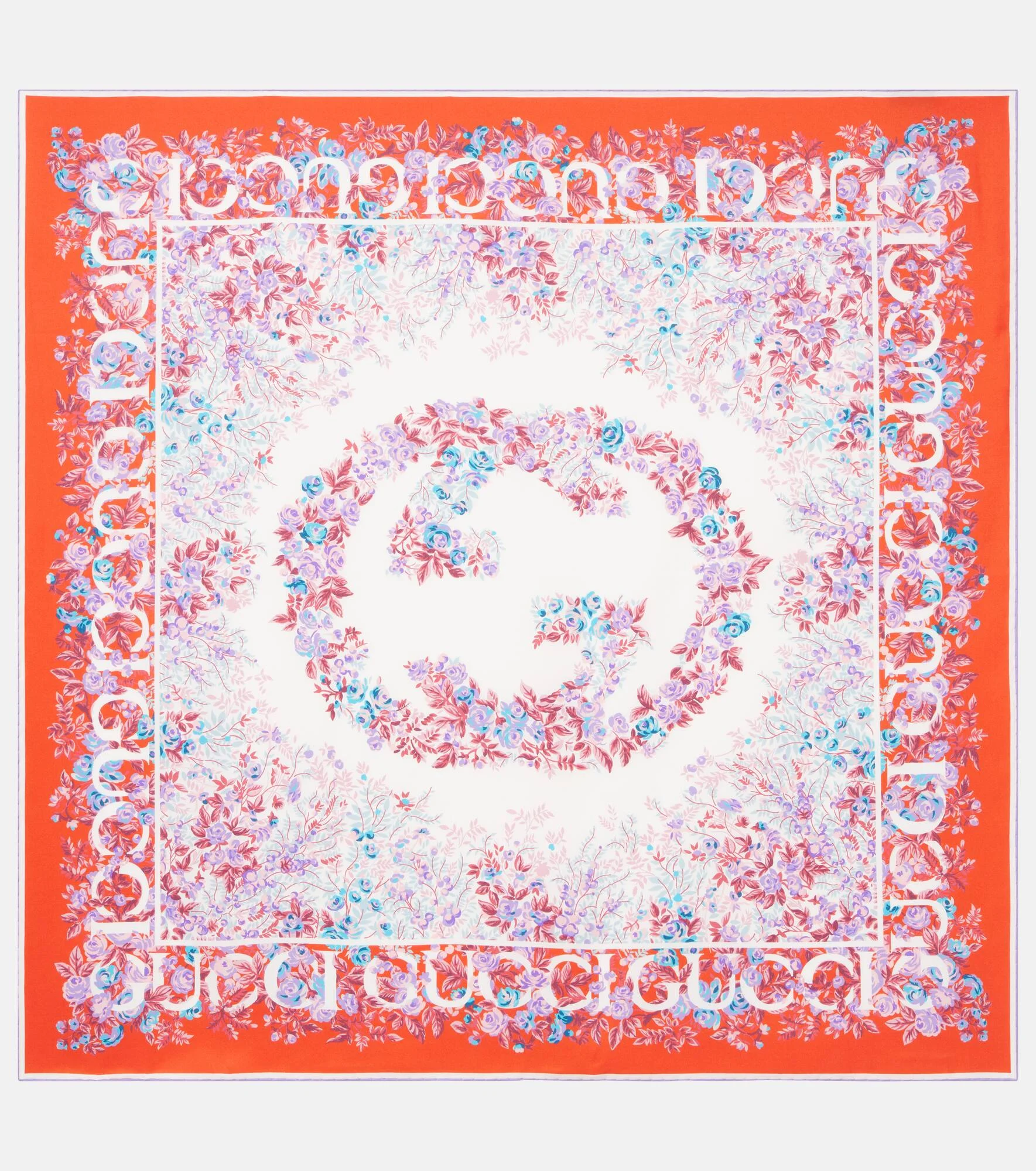 An iconic name within fashion on a global scale, Gucci was founded in Florence in 1921. This scarf is made in Italy from silk twill to a printed design. Product Details - Material: 100% silk - Care instructions: dry clean - Made in Italy - Color: multicoloured - Designer color name: Orange/Light Purple - Item color: orange - Item number: P01118065 Size & Fit - Length 90cm-35.5" - Width 90cm-35.5"
