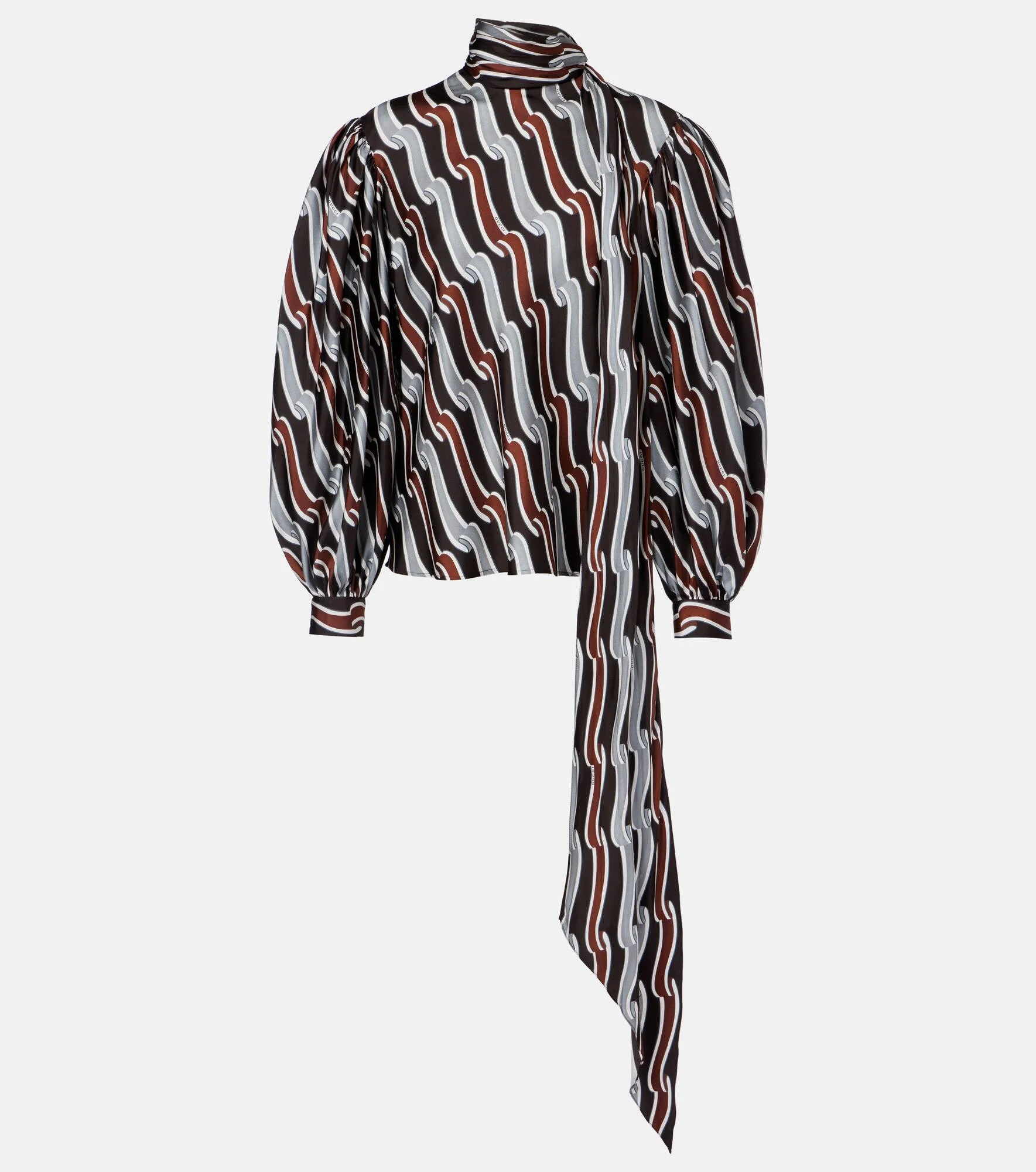 Gucci continues to redefine luxury and pursue its commitment to excellence and creativity. This printed blouse is crafted in Italy from pure silk and features a charming self-tie neck and voluminous sleeves. Product Details - Material: 100% silk - Care instructions: dry clean - Made in Italy - Color: multicoloured - Designer color name: Grey/Brown/Mc - Item color: multicolor - Material II: 100% polyamide - Closure: button fastening - Self-tie neck - Cuff: buttoned - Item number: P01119314 Size & Fit - True to size - Straight fit - Non-stretchy fabric - Falls below the hip - The model seen in the picture is 178cm-5'10" and wearing a size IT 40