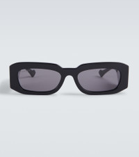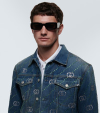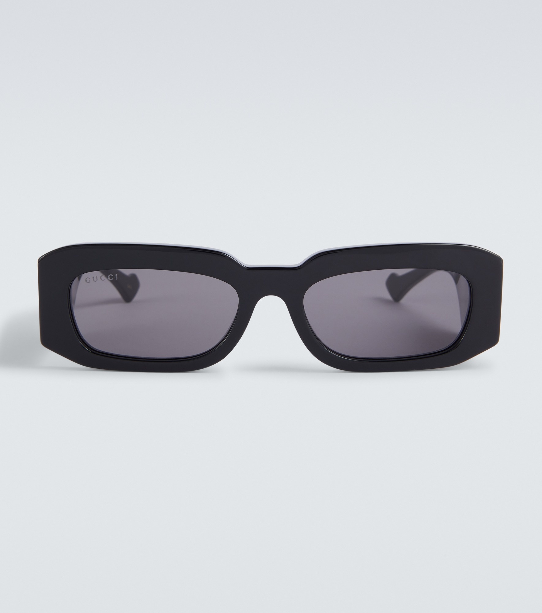 Drawing inspiration from '90s styles, these black sunglasses from Gucci boast thick acetate frames. Detailed with gold-tone lettering at the temples, they feature tinted lenses offering 100% UVA/UVB protection. Product Details - Frame material: acetate - Frame color: black - Lens filter category 3 - Lens color: black - Made in Italy - Includes: case and presentation box - comes with cleaning cloth - Designer color name: Black-Black-Grey - Item number: P00873379 Size & Fit - Lens width: 54mm-2.15" - Bridge size: 19mm-0.75" - Earpiece length: 145mm-5.7"