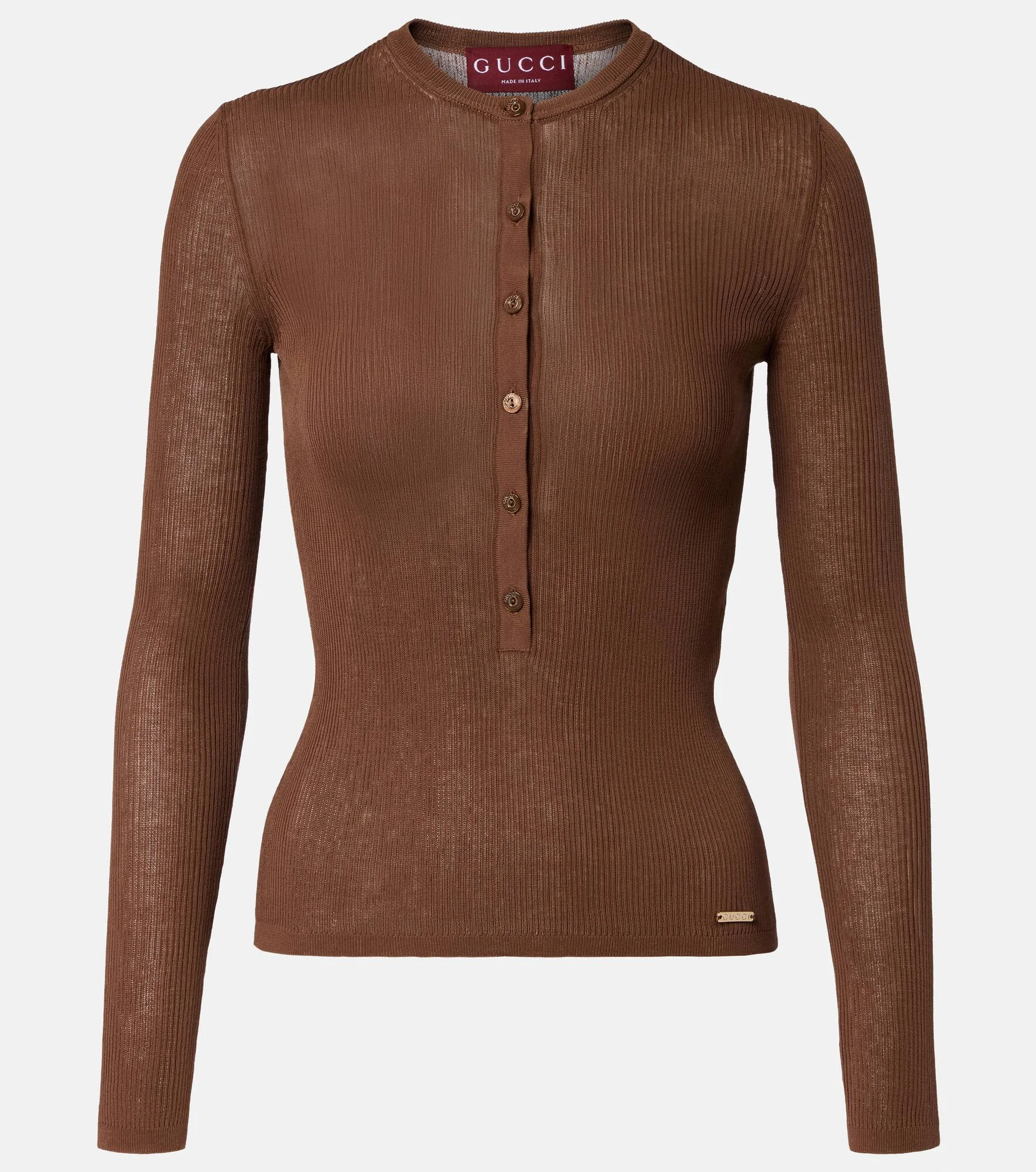 Since its foundation in Florence in 1921, Gucci has combined innovative techniques with traditional craftsmanship. This Henley shirt is crafted from pure cotton and features a partially buttoned front and a ribbed-knit finish. Product Details - Material: 100% cotton - Care instructions: dry clean - Made in Italy - Color: brown - Designer color name: Creamy Coffee - Item color: brown - Trim: 90% cotton, 8% polyamide, 2% elastane - Contains non-textile parts of animal origin - Closure: buttoned front - Item number: P01119187 Size & Fit - True to size - Fitted - Stretchy fabric - Falls to the hip - The model seen in the picture is 178cm-5'10" and wearing a size XS