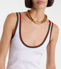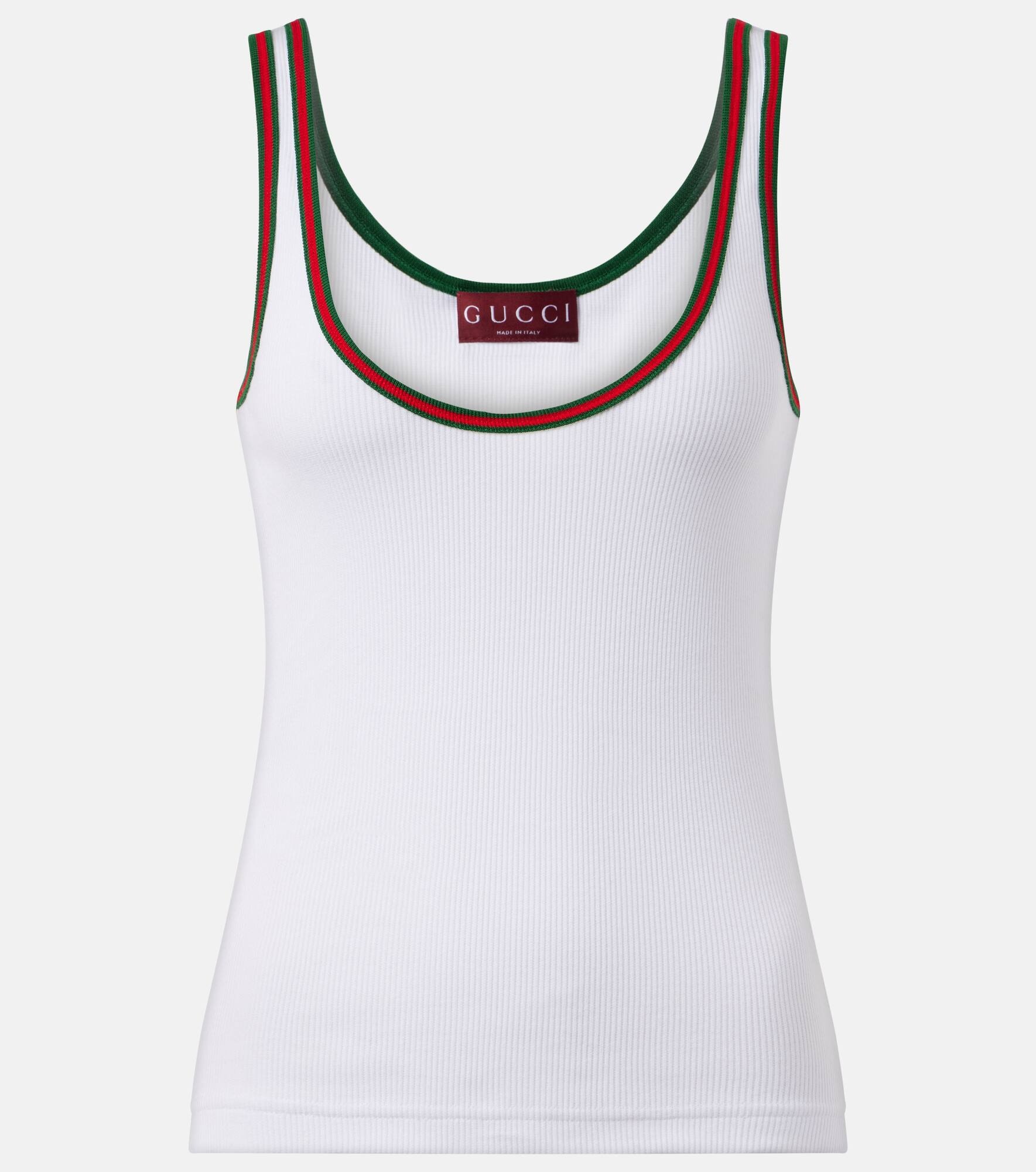 This ribbed-knit cotton tank top from Gucci features the label’s signature red and green Web design. It has a wide scoop neck and form-fitting shape that works well alone or under a blazer. Product Details - Material: 98% cotton, 2% elastane - Care instructions: hand wash - Made in Italy - Designer color name: White/Mix - Trim: 100% cotton - Embroidery: 100% polyester - Item number: P01004095 Size & Fit - True to size - Fitted - Stretchy fabric - Falls to the hip - The model seen in the picture is 178cm-5'10" and wearing a size XS