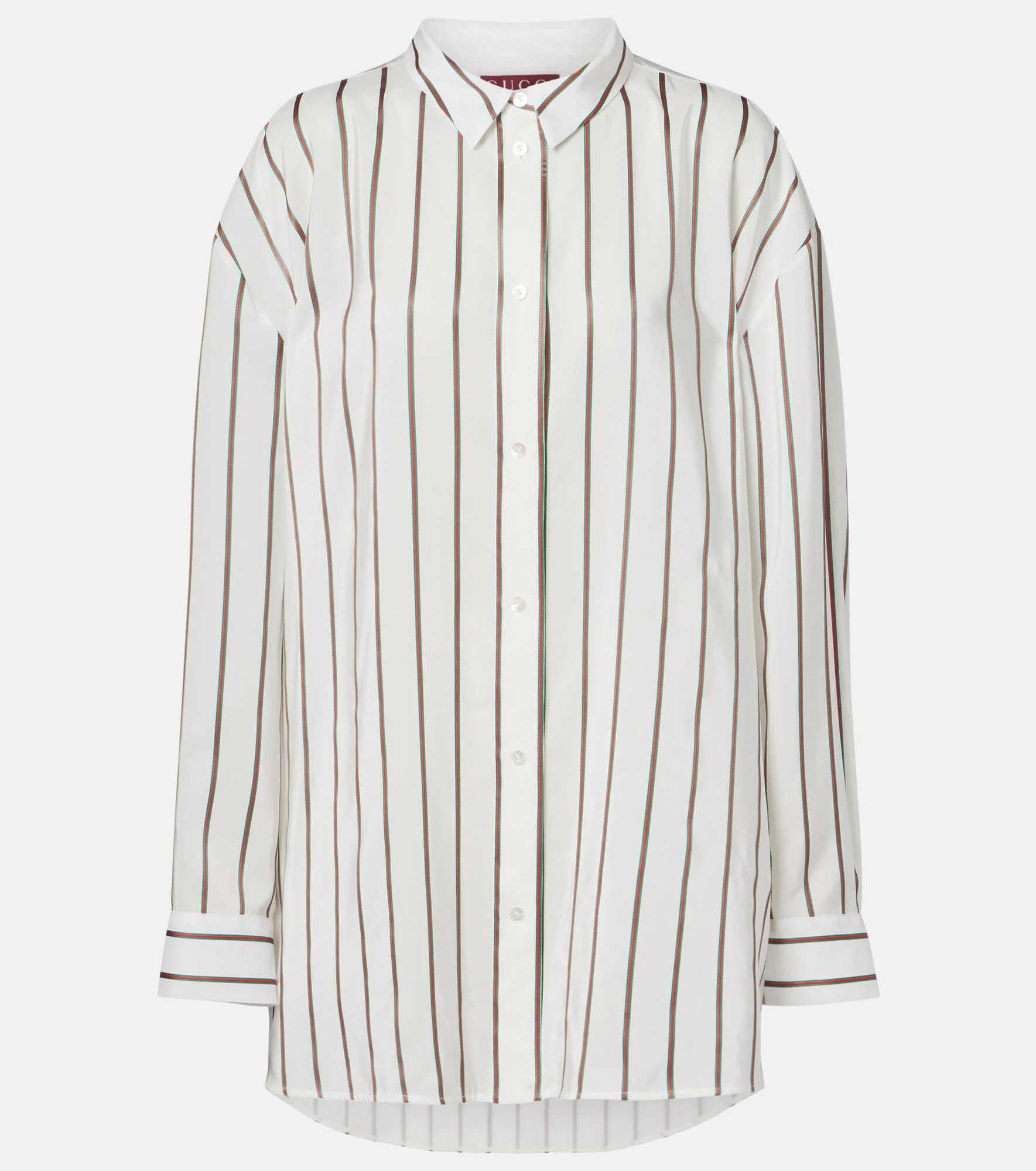 This shirt from Gucci is crafted from a fluid silk-blend fabric, showcasing a relaxed silhouette. The design is decorated all over with jacquard stripes in the signature green and red detail. Product Details - Material: 92% silk, 8% polyester - Care instructions: dry clean - Made in Italy - Color: white - Designer color name: White/Green/Mc - Collar: classic (Straight point) - Closure: buttoned placket - Contains non-textile parts of animal origin - Hem: rounded - Cuff: two buttons - Item number: P01119311 Size & Fit - True to size - Dropped shoulders - Oversized - Non-stretchy fabric - Falls below the hip - The model seen in the picture is 178cm-5'10" and wearing a size IT 40