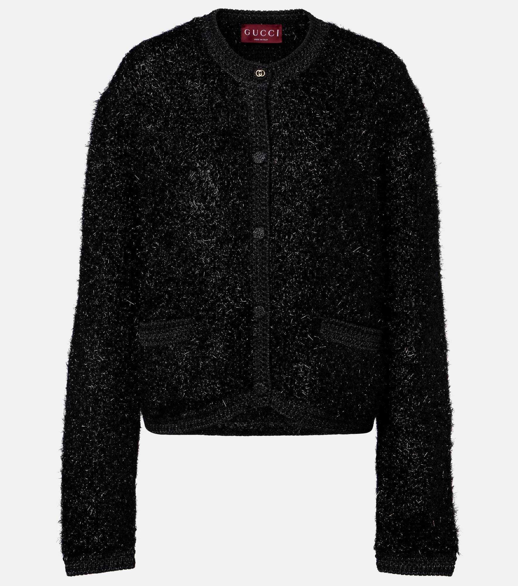 Bring a spark to your knitwear collection with this cardigan from Gucci. Made from wool-blend and tinsel yarns, this design is finished with tonal trims and a small Interlocking G detail at the neckline. Product Details - Material: 39% wool, 36% polyamide, 24% metallic fibres, 1% elastane - Care instructions: dry clean - Made in Italy - Designer color name: Black - Item color: black - Trim: 100% wool - Details: 55% wool, 31% viscose, 14% metallic fibres - Closure: buttoned front - Pockets: welt pockets - Item number: P01119155 Size & Fit - True to size - Dropped shoulders - Designed for a loose fit - Stretchy fabric - Falls to the hip - The model seen in the picture is 178cm-5'10" and wearing a size XS