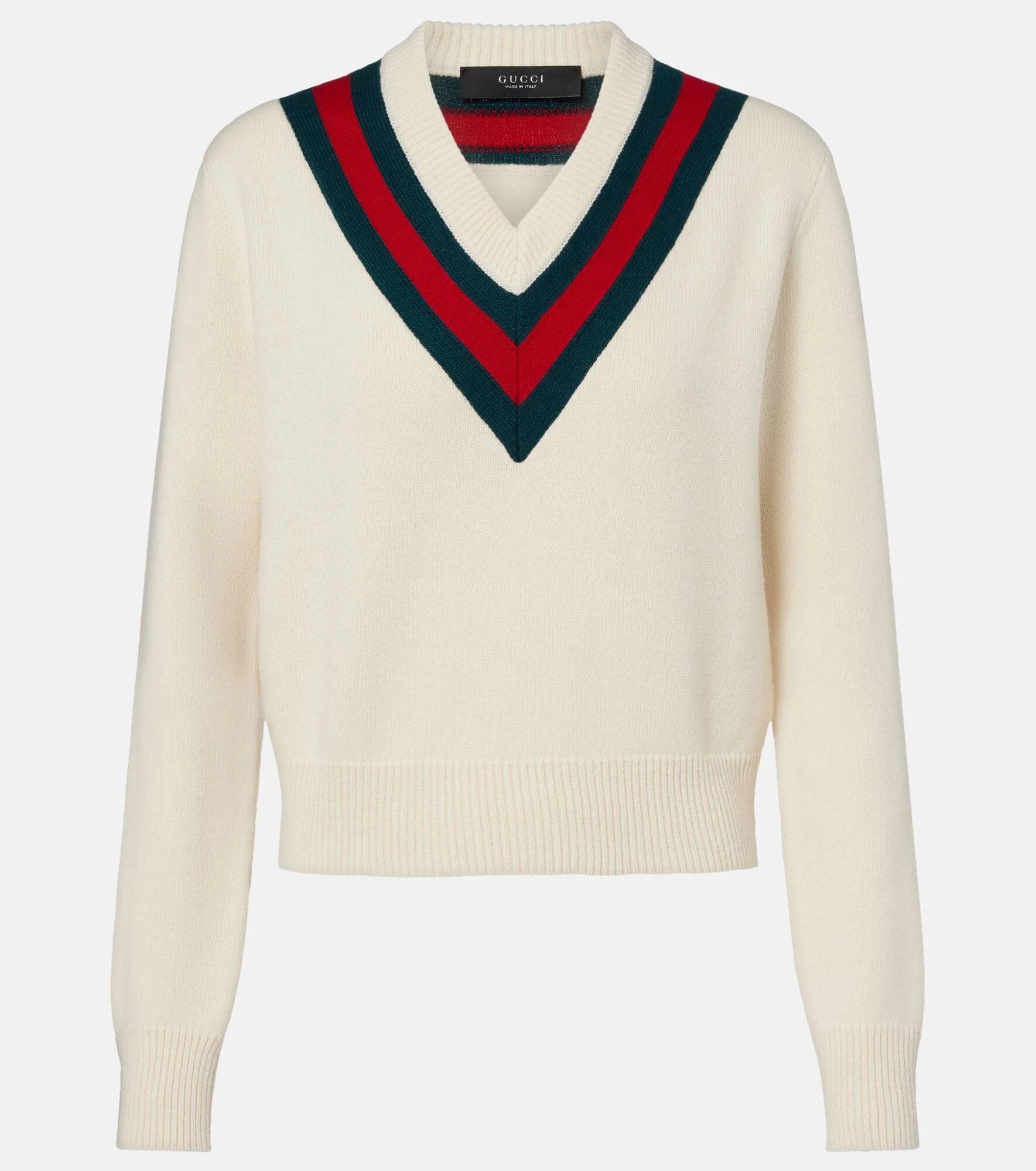 Debuted in 1951, Gucci's signature green and red Web stripe was inspired by equestrian saddle straps. This detail is now knitted into this wool sweater to complement the V-neck silhouette. Product Details - Material: 100% wool - Care instructions: dry clean - Made in Italy - Color: white - Designer color name: Soft White /Green / Red - Cuff: ribbed - Hem: ribbed - Item number: P01150117 Size & Fit - True to size - Straight fit - Slightly cropped - The model seen in the picture is 178cm-5'10" and wearing a size XS