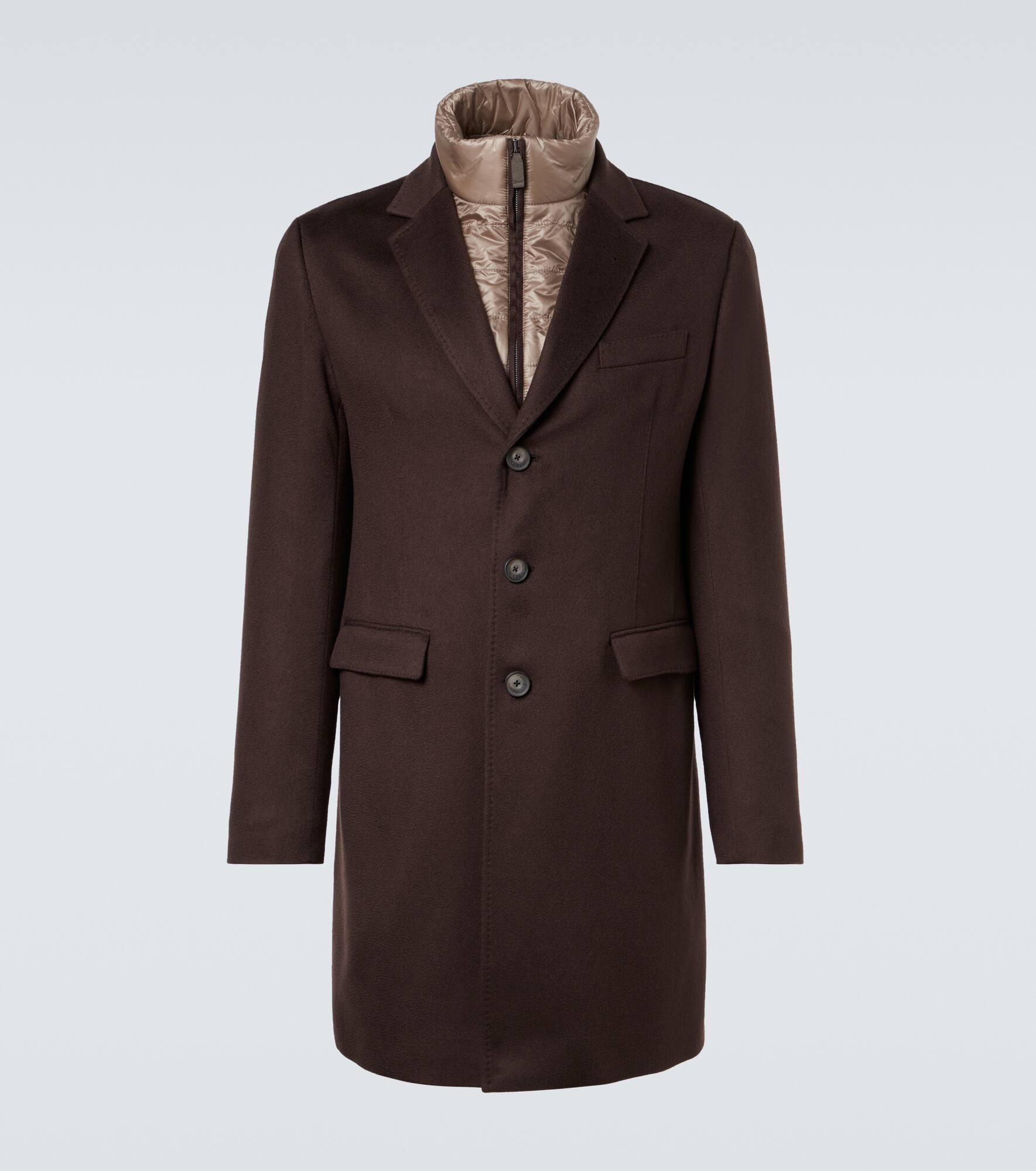 An expert in weatherproof outerwear, Herno was created to tackle the unpredictable climate of Italy’s Erno Valley. This coat is crafted from pure cashmere and features a buttoned and zipped front and a removable bib for added protection. Product Details - Material: 100% cashmere - Care instructions: dry clean - Made in Italy - Designer color name: Marrone - Item color: brown - Material II: 100% polyester - Lining: 100% polyamide - Lining II: 100% cupro - Filling: 100% polyester - Trim: 55% cotton, 45% polyester - Material III: 90% polyester, 10% elastane - Coating: 100% polyurethane - Closure: single-breasted (three buttons) - Pockets: flap pockets, welt pocket, internal pocket - Cuff: four buttons - Detachable trim - Item number: P01070033 Size & Fit - True to size - Shoulder pad inserts - Straight fit - Non-stretchy fabric - Height of model is 192cm-75.5" and wears a size IT 50
