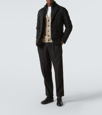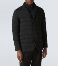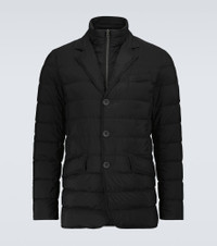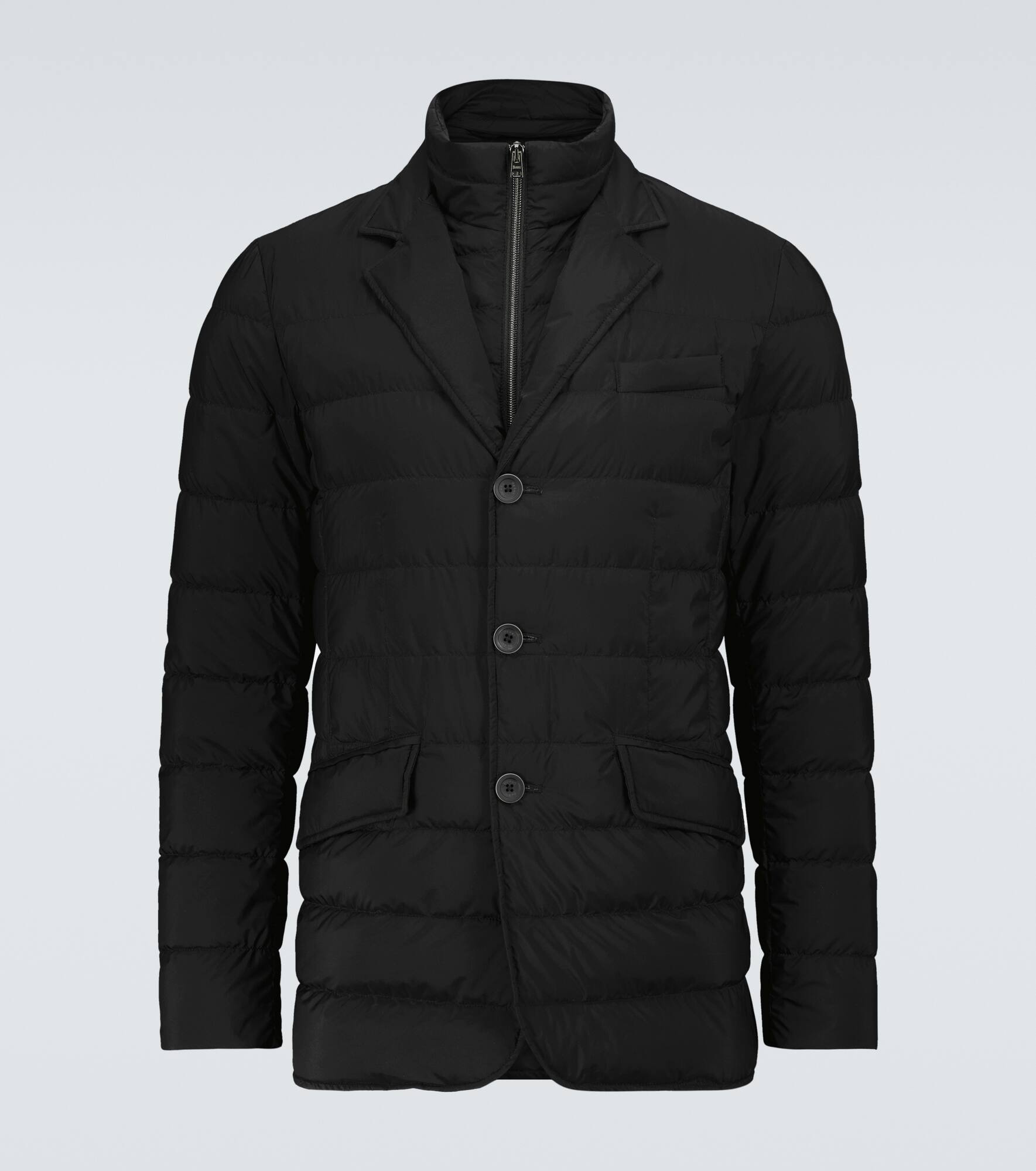 Crafted from technical fabric, this black down-filled jacket from Herno has a classic notched lapel and removable zipped panel at the front for added warmth. Product Details - Pockets: snap-buttoned pockets, internal pocket - Lining: fully lined, 100% polyamide - Care instructions: dry clean - Made in Romania - Trim: 65% acetate, 35% polyester - Material: 100% polyamide - Designer color name: Nero - Filling: 90% down, 10% feathers - Closure: two-way zipped front, buttoned front - Item number: P00576206 Size & Fit - Fits small to size - we recommend trying one size larger - Slim fit - Falls below the hip - The model in the picture is 185cm-6'1" and wearing a size EU 50