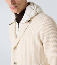 An expert in weatherproof outerwear, Herno was created to tackle the unpredictable climate of Italy’s Erno Valley. The cardigan is handmade from ribbed-knit wool and features a detachable drawstring hood, and a buttoned front. Product Details - Material: 100% wool - Care instructions: machine wash at 30 degrees - Handmade in Turkey - Designer color name: Bianco - Item color: white - Material II: 86% polyamide, 14% elastane - Lining: 86% polyamide, 14% elastane - Filling: 100% polyester - Detachable hood - Drawstring hood - Closure: buttoned front, concealed zipper - Pockets: slit pockets, internal pockets - Cuff: ribbed - Hem: ribbed - Item number: P01044020 Size & Fit - True to size - Straight fit - Partly stretchy fabric - Falls to the hip - Height of model is 189cm-74.5" and wears a size IT 50