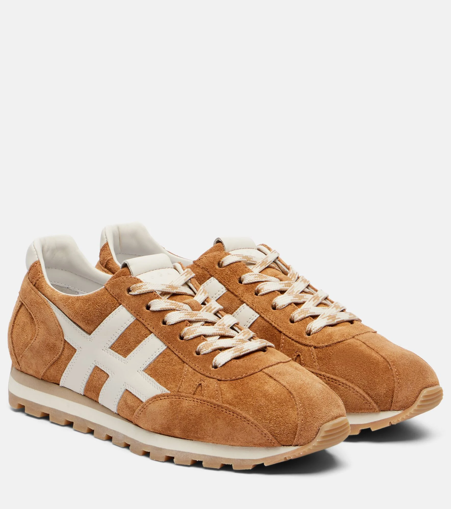 Crafted in Italy from suede, the 86er sneakers from Hogan showcase an H applique detail on the sides. This design features leather insoles and rubber soles on almond-toe silhouettes. Product Details - Upper: calf leather (suede) - Lining: fabric - Sole: fabric insole, rubber sole - Color: brown - Toe shape: almond toe - Made in Italy - Includes: dust bag, extra laces, shoe box - Designer color name: C811+B013 - Item color: brown - Closure: lace-up - Item number: P01137897 Size & Fit - True to size - European sizes - 2cm-1" platform - 3cm-1" wedge heel