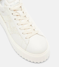 Step into the world of Hogan, the Italian brand that blurs the boundaries between formal and informal footwear. This iteration of the iconic H-Stripe sneakers is crafted from soft leather and finished with crystal embellishments. Product Details - Upper: leather (nappa), leather (suede) - Lining: fabric - Sole: fabric insole, rubber sole - Toe shape: round toe - Made in Italy - Includes: shoe box, dust bag, extra laces - Designer color name: Yogurt+Bianco Marmo - Item color: white - Closure: lace-up - Item number: P01080722 Size & Fit - Fits slightly large to size - we recommend trying a half size smaller - European sizes - 4cm-1.5" platform (size EU 38) - 5cm-2" wedge heel (size EU 38)