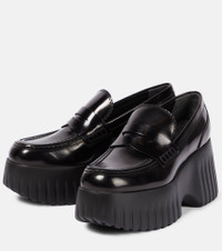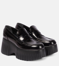 Step into the world of Hogan, the Italian brand that blurs the boundaries between formal and informal footwear. The H-Stripes loafers arrive in polished leather with a classic penny bridge resting atop chunky wedge soles. Product Details - Sole: leather insole, rubber sole - Toe shape: round toe - Upper: leather - Comes with a box - Designer color name: Nero - Made in Italy - Comes with dust bag - Item number: P00819966 Size & Fit - True to size - Slightly narrow at the back - European sizes - 9cm-3.5" heel (size EU 38) - 5,5cm-2" platform (size EU 38)