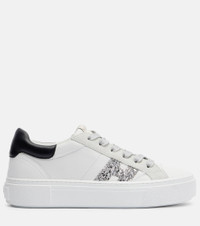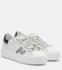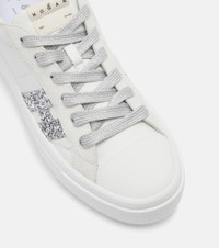 Step into the world of Hogan, the Italian brand that blurs the boundaries between formal and informal footwear. The H705 Allacciato H platform sneakers are made from leather and boast the signature logo initials with glitter embellishments. Product Details - Upper: calf leather - Lining: fabric - Sole: fabric insole, rubber sole - Color: white - Toe shape: round toe - Made in Italy - Includes: extra laces, dust bag, shoe box - Designer color name: B001+B999+B200+B013 - Closure: lace-up - Item number: P01137902 Size & Fit - Fits slightly large to size - we recommend trying a half size smaller - European sizes