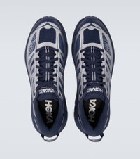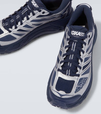 The Mafate Speed 2 running shoes from Hoka One One are designed for endurance and technical terrain. The design features the brand's Vibram® MegaGrip soles and plush cushioning, delivering exceptional traction, support, and standout multicolored style. Product Details - Upper: rubber, fabric - Lining: fabric - Sole: fabric insole, rubber sole - Toe shape: round toe - Made in Vietnam - Includes: shoe box, extra laces - Designer color name: Varsity Navy/Silver - Item color: silver - Closure: lace-up - Item number: P01122559 Size & Fit - Fits small to size - we recommend trying one size larger - Unisex style - US sizes