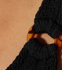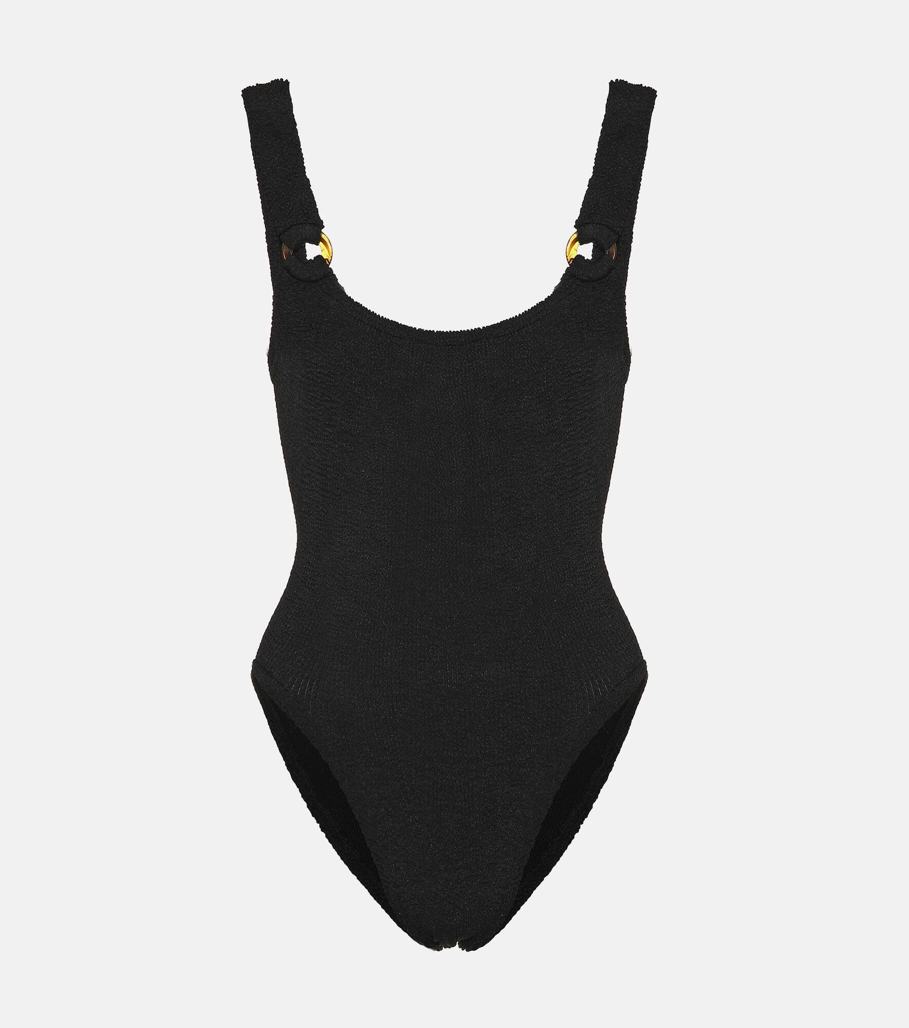 Hunza G's Domino swimsuit has been crafted with the British brand's hallmark puckered seersucker finish from stretch LYCRA®. The solid-black style works a high-leg, scooped-neck, low-back silhouette, and its thick straps are finished at the front with tortoiseshell hoop detailing. Complete your poolside look with a wide-brimmed straw hat. Product Details - Material: 88% nylon, 12% elastane - Made in the UK - Care instructions: hand wash - Designer color name: Black - Item number: P00365713 Size & Fit - True to size - One size: perfect fit for sizes XS-L - High-cut leg - One size