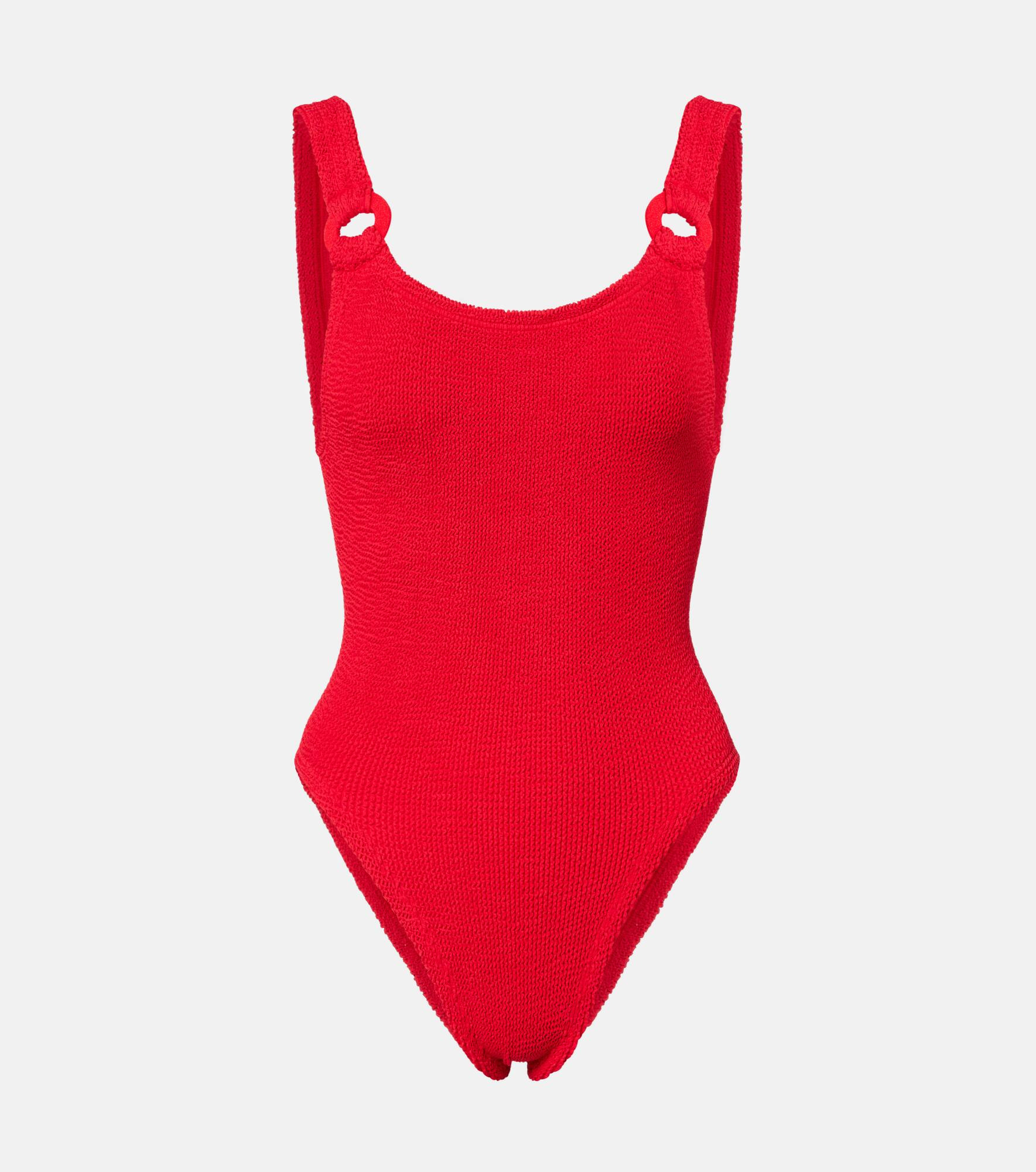 A brand favorite, the Domino swimsuit features a classic silhouette with a scoop neckline and low-cut back. This swimwear piece is made using Hunza G's Seamless Crinkle Technology, making it one-size-fits-all. Product Details - Material: 97% polyamide, 3% elastane - Care instructions: machine wash at 30 degrees - Made in Morocco - Designer color name: Red - Item color: red - Item number: P01123508 Size & Fit - True to size - One size: perfect fit for sizes XS-L - Unpadded Top - High-cut leg - One size