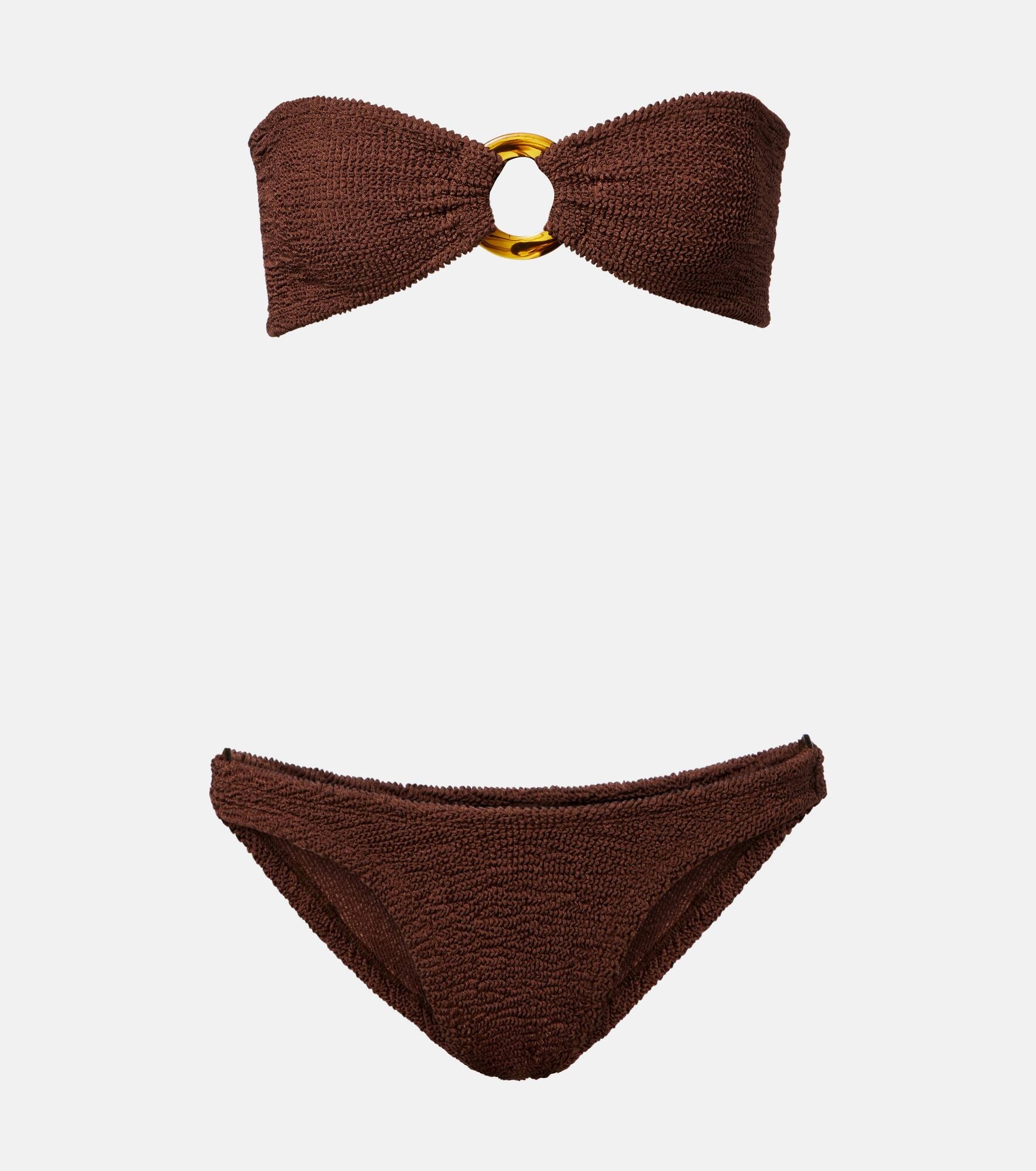 The Gloria bikini showcases a hoop detail at the center of the bust. This swimwear piece is made using Hunza G's Seamless Crinkle Technology, making it one-size-fits-all. Product Details - Material: 97% polyamide, 3% elastane - Care instructions: machine wash at 30 degrees - Made in the UK - Designer color name: Metallic Chocolate - Item color: brown - Two-piece set - Elasticated waistband - Item number: P01088143 Size & Fit - True to size - One size: perfect fit for sizes XS-M - Strapless - Cup size: A/B - Unpadded Top - Medium-cut leg - One size