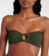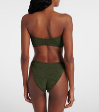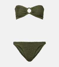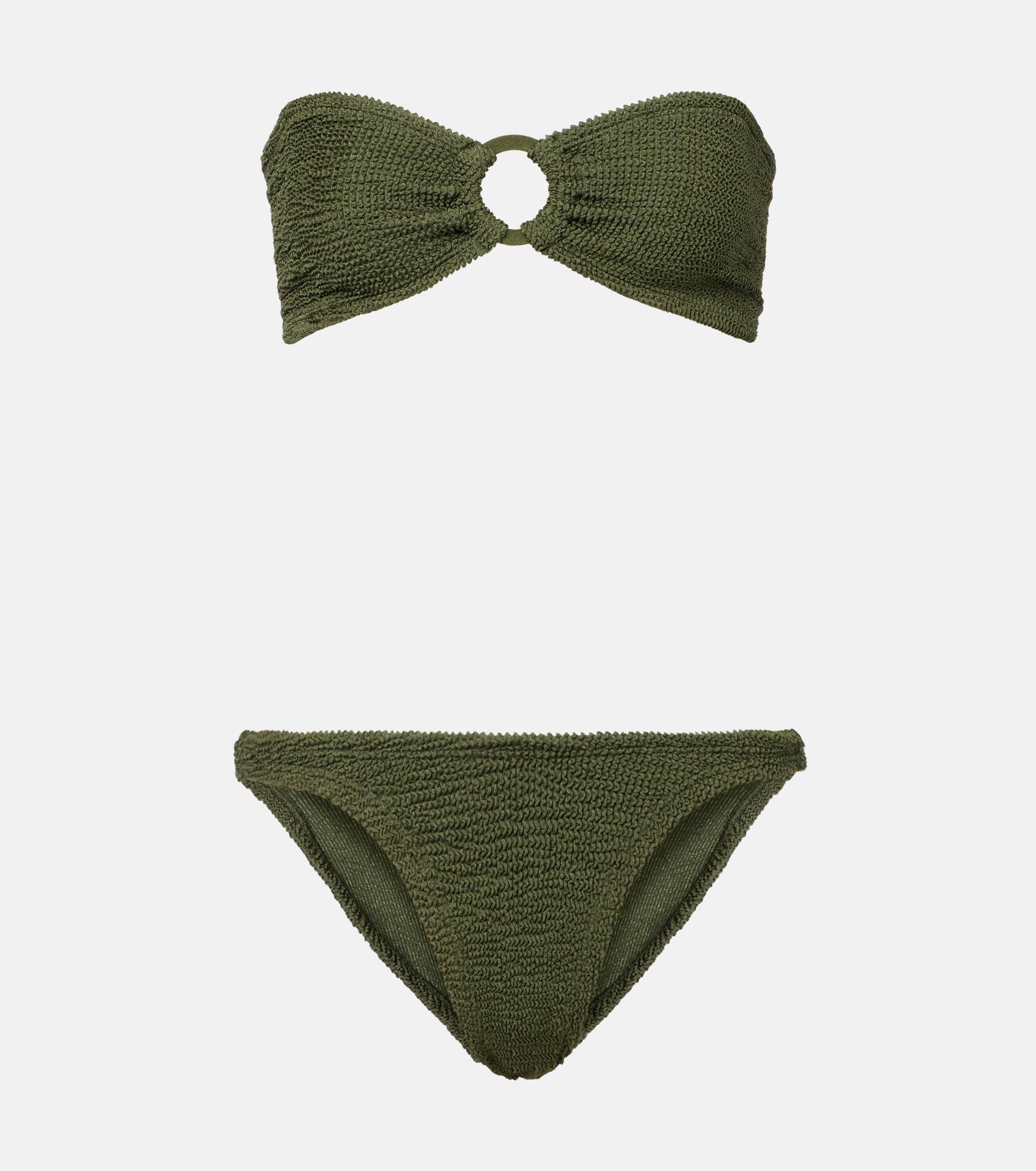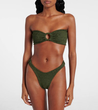 The Gloria bikini from Hunza G is crafted in the brand's Original Crinkle™ fabrication. Featuring a strapless top with tonal ring at the center, its medium-cut leg bottoms complete the look for a comfortable and stylish seaside look. Product Details - Material: 97% polyamide, 3% elastane - Care instructions: machine wash at 30 degrees - Made in Morocco - Designer color name: Metallic Khaki - Item color: green - Two-piece set - Item number: P01052550 Size & Fit - True to size - One size: perfect fit for sizes XS - L - Strapless - Unpadded Top - Medium-cut leg