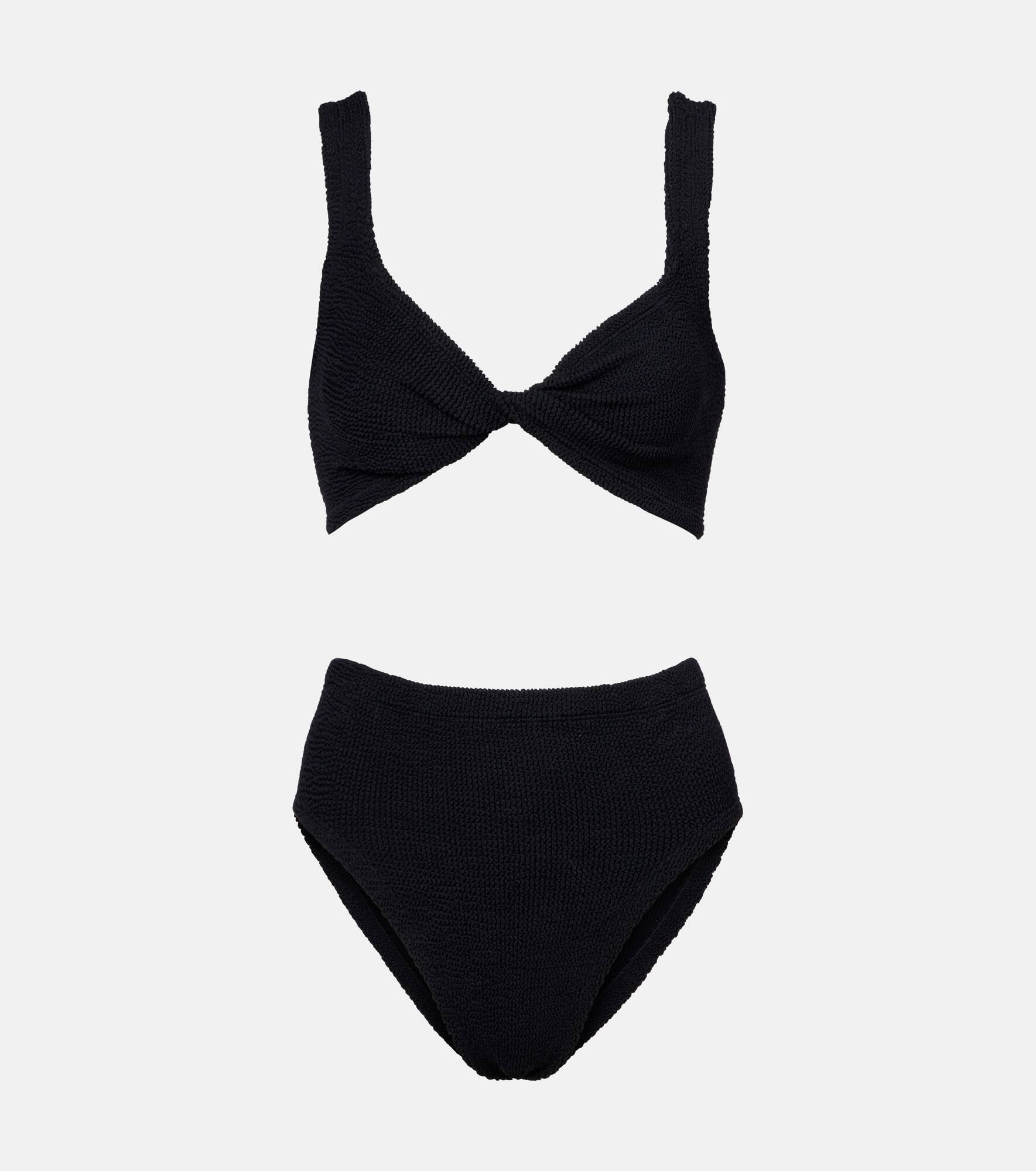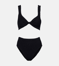 Pack the Jamie bikini for your next warm-weather getaway. This swimwear piece is made using Hunza G's Seamless Crinkle Technology, making it one-size-fits-all. Featuring high-rise bikini bottoms and a twist-detail bikini top, the set is primed to become one of your favorites. Product Details - Material: 97% polyamide, 3% elastane - Care instructions: machine wash at 30 degrees - Made in Morocco - Designer color name: Black - Item color: black - Two-piece set - Item number: P01052538 Size & Fit - True to size - One size: perfect fit for sizes XS-M - High-waisted - Unpadded Top - High-cut leg