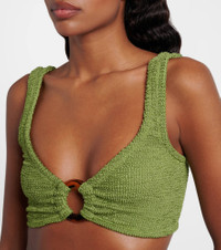 Pack the Julia bikini from Hunza G for your next warm-weather getaway. Made using the brand's Seamless Crinkle Technology, this set features high-cut bikini bottoms and a ring-detail top. Product Details - Material: 97% polyamide, 3% elastane - Care instructions: machine wash at 30 degrees - Made in the UK - Designer color name: Mettalic Moss/Mettalic Khaki - Item color: green - Two-piece set - Item number: P01134395 Size & Fit - True to size - One size: perfect fit for sizes XS-L - Unpadded Top - High-cut leg - One size