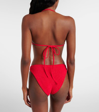 The Kacey bikini is made using Hunza G's Seamless Crinkle Technology, making it one-size-fits-all. This swimwear piece features an adjustable halterneck bikini top with a checked pattern and classic bikini bottoms. Product Details - Material: 97% polyamide, 3% elastane - Care instructions: hand wash - Made in the UK - Designer color name: Red/Red - Item color: red, white - Lining: 90% polyamide, 10% elastane - Closure: self-ties - Item number: P01052578 Size & Fit - True to size - One size: perfect fit for sizes XS-L - Unpadded Top - High-cut leg