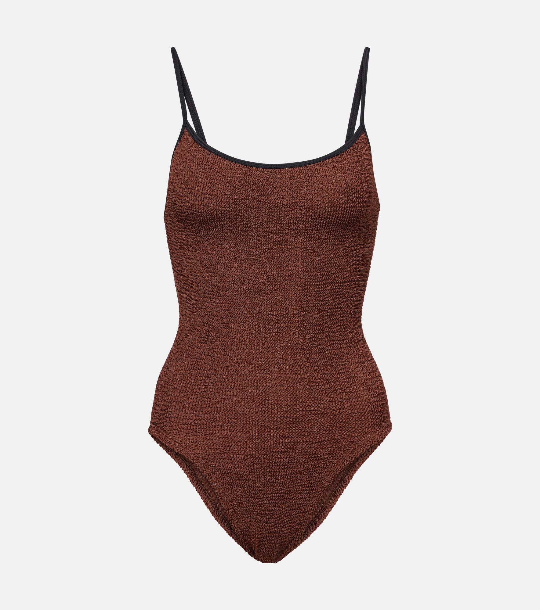 Primed for sunny getaways and beyond, the Pamela swimsuit from Hunza G deserves a spot in your vacation suitcase. This swimwear piece is made using Hunza G's Seamless Crinkle Technology, making it one-size-fits-all. It's completed with delicate straps, contrasting trims, and a scooped neckline. Product Details - Material: 97% polyamide, 3% elastane - Care instructions: machine wash at 30 degrees - Made in the UK - Designer color name: Metallic Chocolate/ Black - Item color: brown - Item number: P01052555 Size & Fit - True to size - One size: perfect fit for sizes XS-L - Unpadded Top - High-cut leg