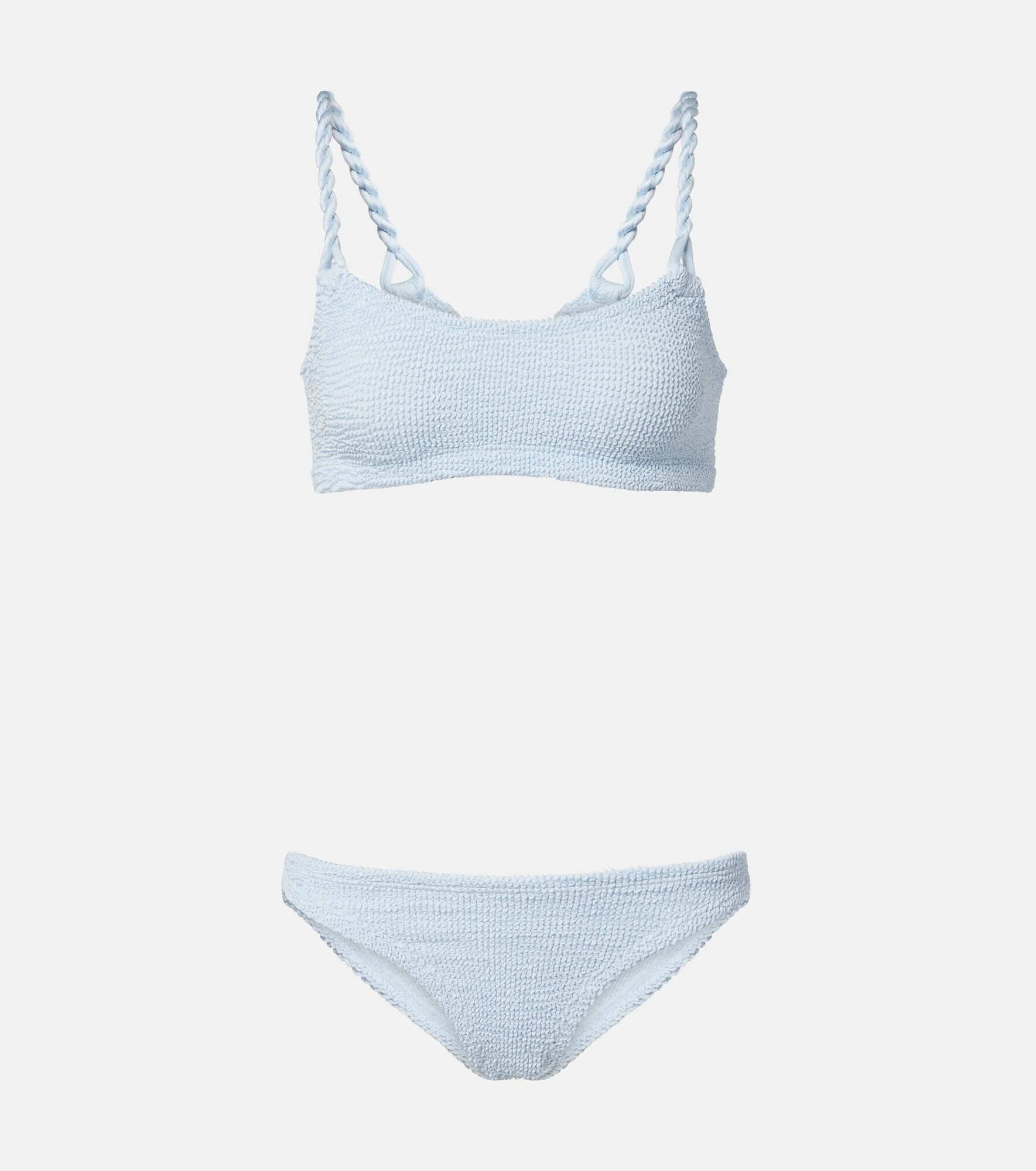 The Phoebe bikini is made using Hunza G's Seamless Crinkle Technology, making it one-size-fits-all. The set features triangle bottoms and a bandeau top with twisted straps. Product Details - Material: 97% polyamide, 3% elastane - Care instructions: machine wash at 30 degrees - Made in Morocco - Color: blue - Designer color name: Metallic Ice Blue - Two-piece set - Item number: P01164281 Size & Fit - True to size - One size: perfect fit for sizes XS-L - Unpadded Top - High-cut leg