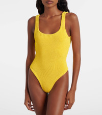 The Square Neck swimsuit has wide straps and high-cut legs that elongate the figure. Hunza G's signature crinkled fabric uses Seamless Crinkle Technology that makes each piece one-size-fits-all. Product Details - Material: 97% polyamide, 3% elastane - Care instructions: machine wash at 30 degrees - Made in Morocco - Designer color name: Sunflower - Item color: yellow - Item number: P01123512 Size & Fit - True to size - One size: perfect fit for sizes XS-L - Unpadded Top - High-cut leg
