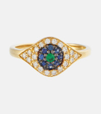 The Cats Eye ring is a label signature, handmade in Ileana Makri's native Greece from 18-karat yellow gold. Its evil-eye motif is created with a beguiling combination of white diamonds, blue sapphires, and a green tsavorite garnet in the center. Product Details - Material: 18kt yellow gold - Stone I: diamond, pavé setting - Stone II: sapphire, pavé setting - Stone III: tsavorite, pavé setting - Made in Greece - Designer color name: Yellow Gold - Item number: P00579151 Size & Fit - Max. width 15mm-0.6"