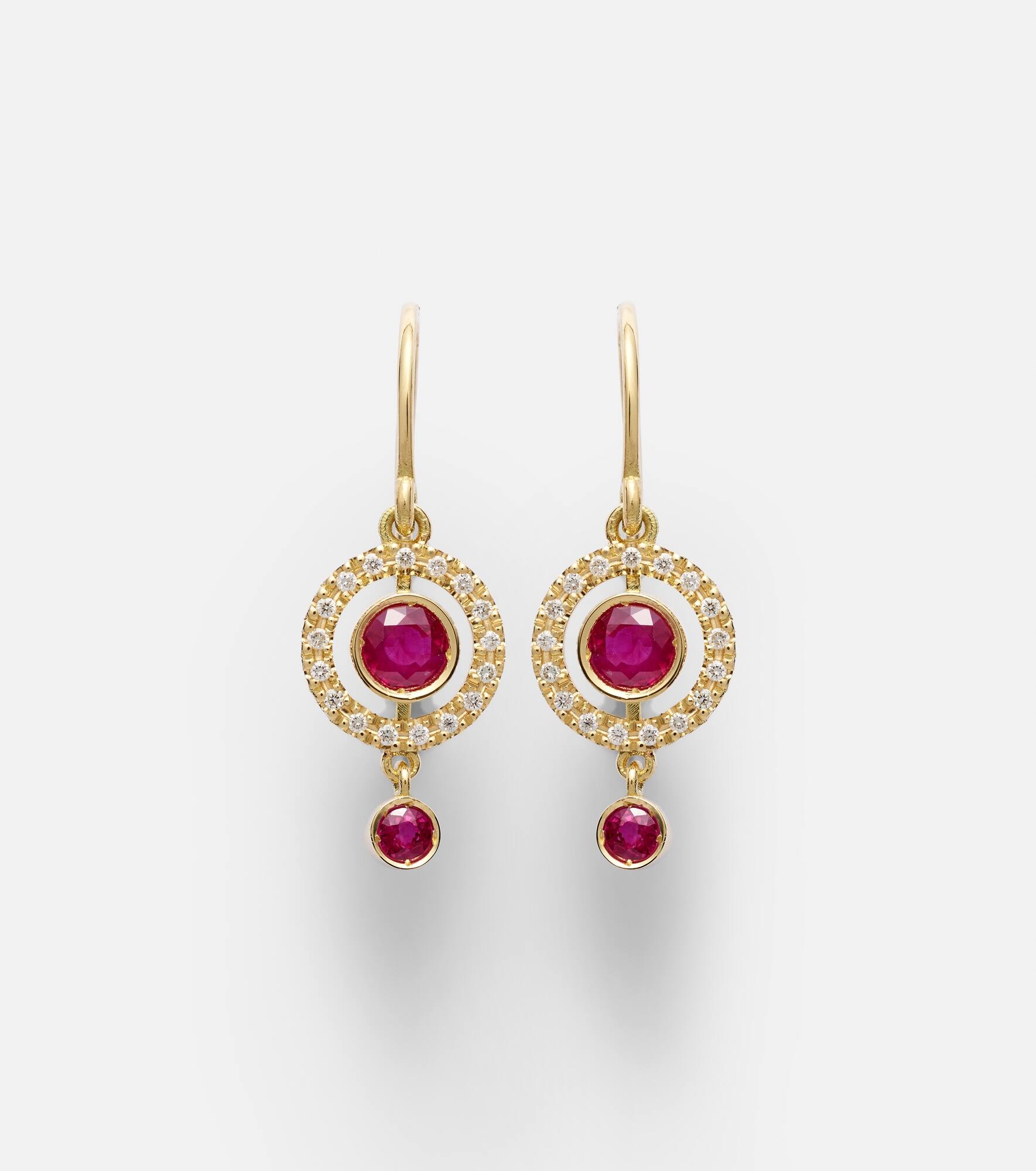 Orbit 18kt gold drop earrings with rubies and diamonds