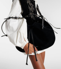 A testament to authentic and effortless Parisian style, the Bolton Medium shoulder bag by Isabel Marant is expertly crafted from black suede. The design features an adjustable shoulder strap, a drawstring top, and a removable zippered pouch. Product Details - Material: calf leather (suede) - Lining: fabric - Made in Tunisia - Designer color name: Black/Silver - Item color: black - Detachable, adjustable shoulder strap - Internal details: single compartment - Detachable zipped pouch - Closure: magnetic fastening - Includes: dust bag - Item number: P01136119 Size & Fit - Height 25cm-10" - Width 38,5cm-15" - Depth 8cm-3" - Length shoulder strap 71cm-28" - Clutch height 15cm-6" - Clutch width 20cm-8"