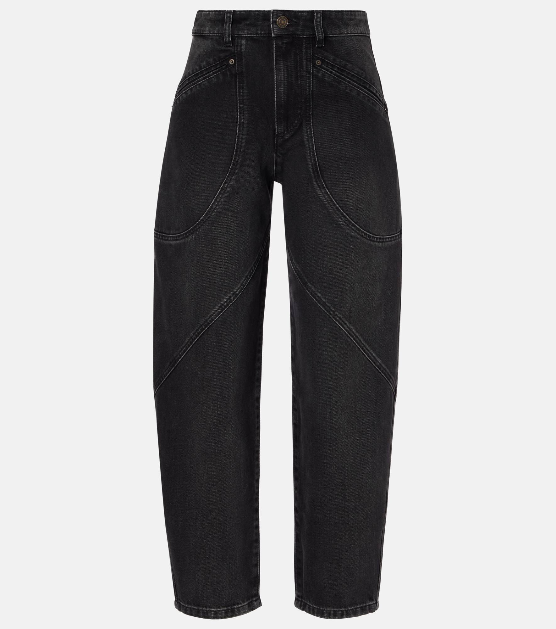 Isabel Marant’s Catarina jeans blend a barrel-leg silhouette with distinctive topstitched detailing for added character. Rendered in washed black, they feature a relaxed fit and piped side pockets for a subtle utilitarian edge. Product Details - Material: 100% cotton (organic) - Care instructions: machine wash at 30 degrees - Made in Morocco - Designer color name: Faded Black - Item color: black - Lining: 65% polyester, 35% cotton - Pockets: frogmouth pockets, back pockets - Closure: zip and button fastening - Belt loops - Item number: P01074427 Size & Fit - True to size - Non-stretchy fabric - Tapered leg - Mid-rise - The model seen in the picture is 178cm-5'10" and wearing a size FR 36