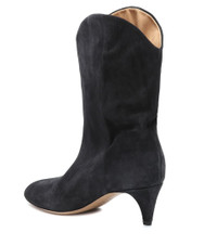 Walk the line in the Western-inspired Dernee ankle boots from Isabel Marant. Cut from soft suede in "Faded Black," this curved pair is set on a modest kitten heel for effortless wear. Dress yours up with a miniskirt and fitted blazer, or keep it simple in faded denim and a printed T-shirt. Product Details - Upper: calf leather - Lining: leather - Sole: leather insole and sole - Toe shape: round toe - Made in Portugal - Includes: dust bags, shoe box - Designer color name: Faded Black - Item number: P00432283 Size & Fit - True to size - Half sizes please take the next size up - French sizes - 6cm-2.5" heel (size EU 38)