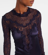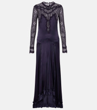 The Dolores gown from Isabel Marant is made from a mostly silk-blend satin with exceptional drape and lovely sheen. The design features delicate lace trims around the neck to accent the romantic design. Product Details - Material: 94% silk, 6% elastane - Care instructions: dry clean - Made in Romania - Designer color name: Black Midnight - Item color: blue - Trim: 67% cotton, 28% polyamide, 5% elastane - Material II: 80% cotton, 20% polyamide - Material III: 40% cotton, 36% viscose, 24% polyamide - Insert: 86% cotton, 14% polyamide - Closure: zipped side, buttoned back - Hem: uneven - Unlined - Item number: P01074398 Size & Fit - True to size - Low back - Semi-sheer - Cinched waist - Partly stretchy fabric - The model seen in the picture is 178cm-5'10" and wearing a size FR 36