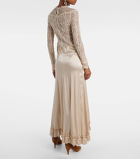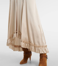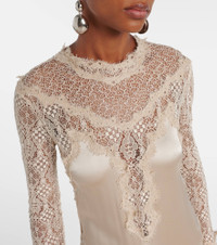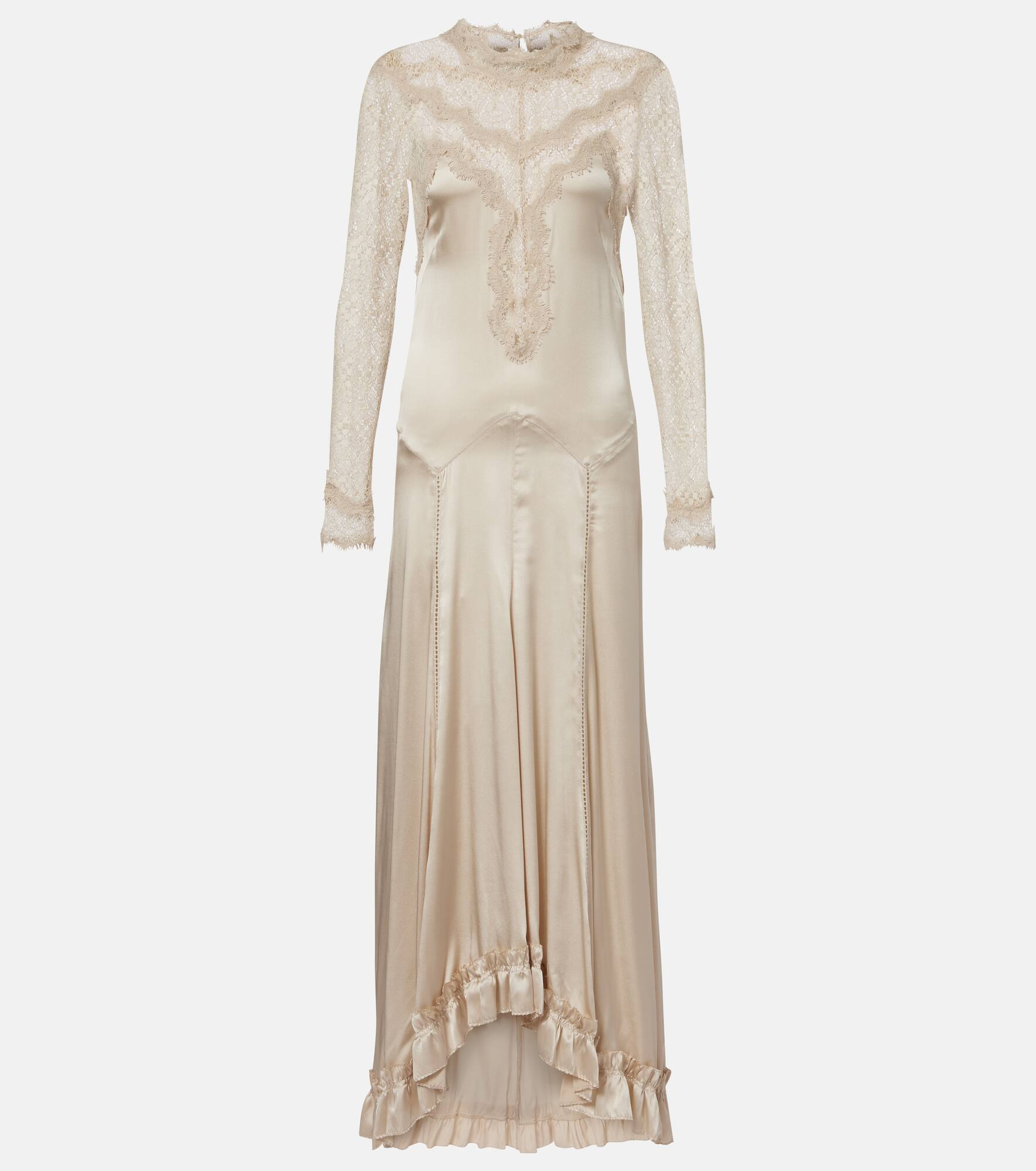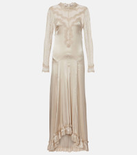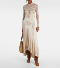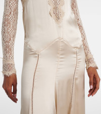 The Dolores gown from Isabel Marant is made from a mostly silk-blend satin with exceptional drape and lovely sheen. The design features delicate lace trims around the neck to accent the romantic design. Product Details - Material: 94% silk, 6% elastane - Care instructions: dry clean - Made in Romania - Designer color name: Champagne - Item color: beige - Trim: 67% cotton, 28% polyamide, 5% elastane - Material II: 80% cotton, 20% polyamide - Material III: 40% cotton, 36% viscose, 24% polyamide - Insert: 86% cotton, 14% polyamide - Closure: buttoned back, zipped side - Hem: uneven - Unlined - Item number: P01074397 Size & Fit - True to size - Low back - Semi-sheer - Cinched waist - Partly stretchy fabric - The model seen in the picture is 178cm-5'10" and wearing a size FR 36